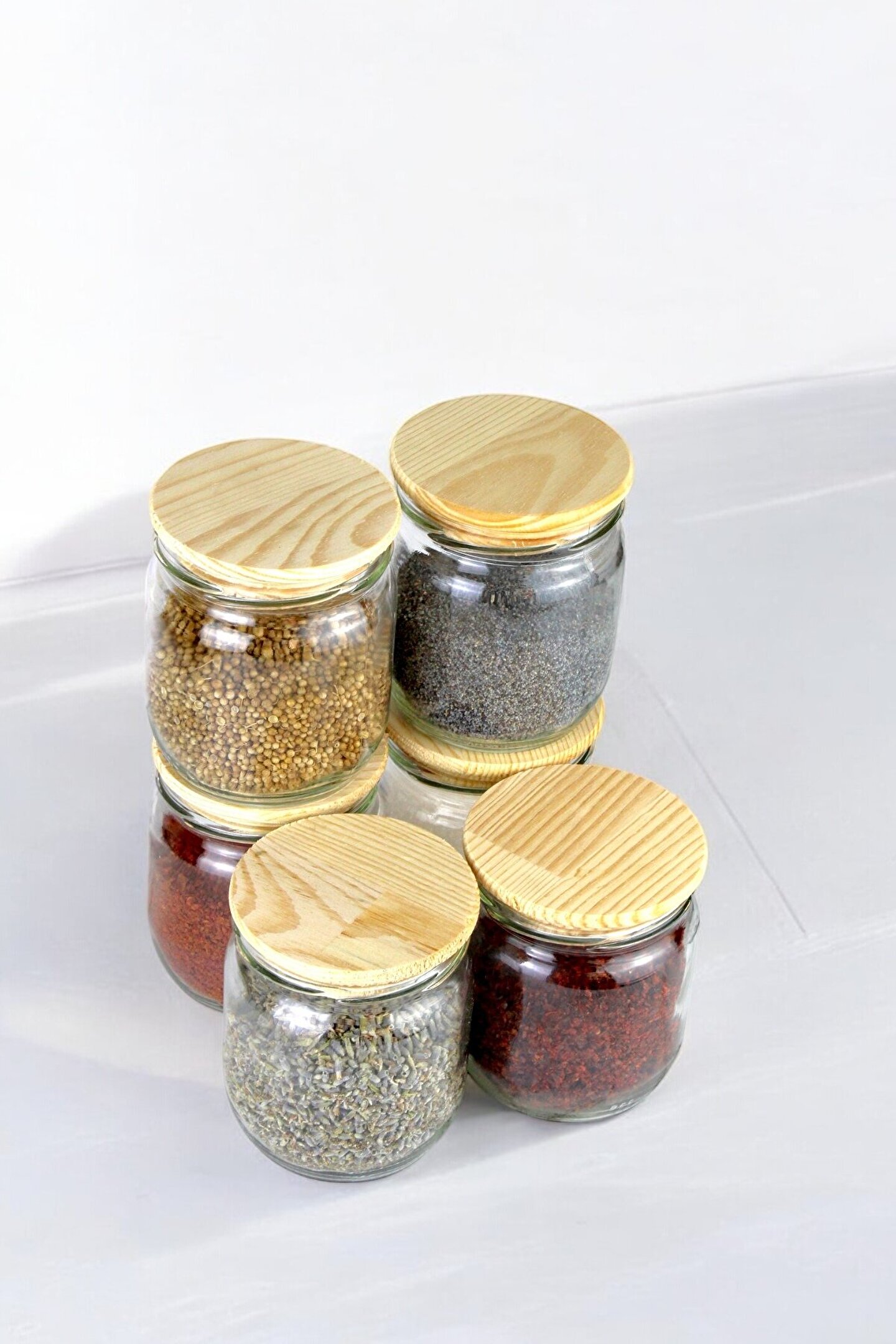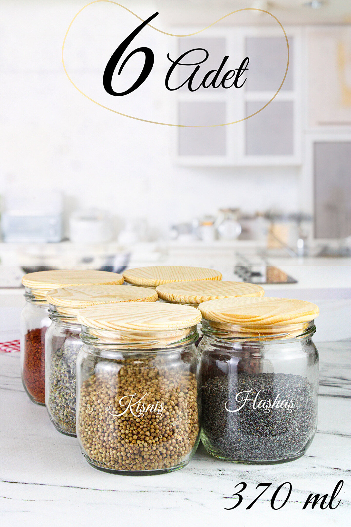 - 6 farklı boyutta cam saklama kavanozları, baharatlarınızı düzenli ve hijyenik bir şekilde saklamanızı sağlar.; - Ahşap vakum kapakları sayesinde kavanozların içindeki baharatlarınız taze kalır ve dökülme riskini azaltır.; - Şık çizgili kapak tasarımı ile mutfak dekorasyonunuza modern bir dokunuş ekler.; - Her sette yer alan etiket hediyeleriyle baharatlarınızın isimlerini kolayca takip edebilirsiniz.; - Toplamda 370 ml hacmiyle geniş kullanım alanı sunar; baharatlarınızın hepsini tek bir sette toplamanızı sağlar.
