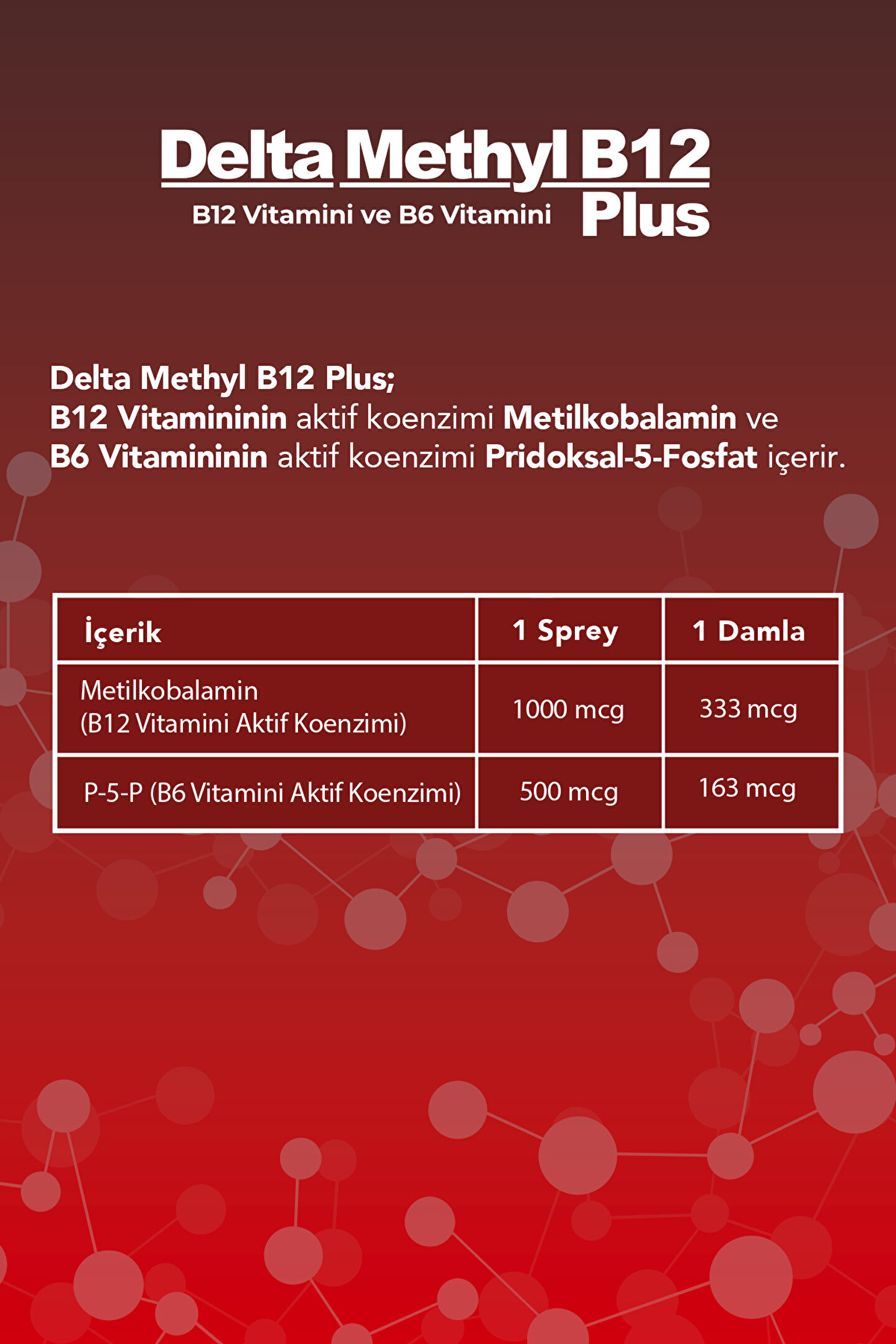 ÜRÜN ÖZELLİKLERİ: SİYANÜRSÜZ B12 B12 vitamininin aktif formu Metilkobalamin (Methylcobalamin) 20ml – 128 Spray Suda çözünen, içeriğindeki kobalt elementi nedeniyle kobalamin olarak da adlandırılan B12, insan organizması için en gerekli vitaminlerden biridir.; ; Yapılan çalışmalarda bu vitamininin homosisteini metiyonine dönüştürme, DNA ve RNA’yı koruma, enerjiyi destekleme, sinir ve beyin hücrelerini koruma, serotonin üretimini uyarma, alyuvar hücrelerinin oluşumuna katkıda bulunma, bağışıklık sistemini destekleme ve olumlu bir ruh hali oluşturma gibi sayısız işlev gördüğü belirlenmiştir.; ; Gıdalarla alınan metilkobalamin midedeki intrensek faktör (IF) tarafından bağırsaklara taşınır, oradan da kan dolaşımı ile beyne ulaşır.; ; Suda çözünen, içeriğindeki kobalt elementi nedeniyle kobalamin olarak da adlandırılan B12 vitamini bir metil grubu vericisidir.; ; Homosistein metabolizmasında, enerji metabolizmasında, immün fonksiyonlarda ve sinir sisteminde önemli fonksiyonları vardır.; ; KULLANIM ŞEKLİ: 1 Puf (sprey) 1.000 mcg, 1 damla 320 mcg Metilkobalamin içerir.; ; Normal kullanım günde 1 puftur.; ; Öneriye göre günlük puf sayısı artırılabilir.; ; Genellikle günde 1 puf yeterli olduğundan 10 ml’lik kutu 2 ay, 20ml’lik kutu 4 ay kullanım içindir.; ; Piridoksal 5’Fosfat formüle B12’nin emilimini arttırmak (sinerjik etki) için eklenmiştir.; ; UYARI : ? Sitemizde satışı yapılan tüm ürünlerin içerik ve alerjen bilgileri bilgi amaçlı olarak yer almaktadır.; ; ? İçerik ve alerjen bilgilerini sürekli kontrol ediyor ve güncelliyoruz ancak en doğru bilgiyi ürün ambalajının üzerinde bulabilirsiniz.; ; ? Alerjiniz ya da özel bir durumunuz varsa ürünü kullanmadan önce doktorunuza danışınız ve ürün ambalajı üzerindeki etiket bilgilerini mutlaka kontrol ediniz.; ; ? Ürün ambalajı ile sitede yer alan bilgiler arasındaki farklardan doğabilecek problemlerde firmamız sorumlu değildir.; ; ? Vegan Bakkal'da satılan hiçbir ürün ilaç değildir, hastalıkların önlenmesi veya iyileştirme edilmesi amacıyla kullanılamaz.;