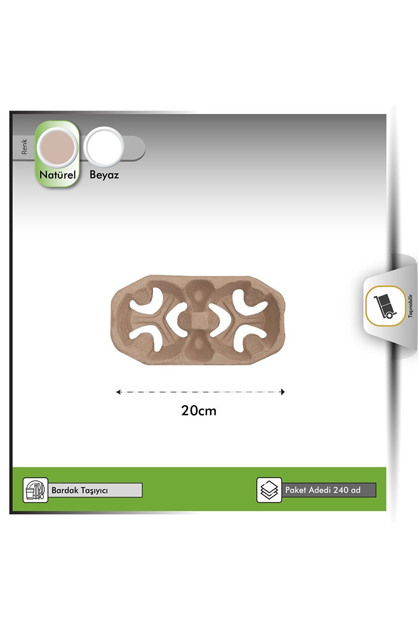 Paket içeriği 100 adettir. ; 20x10,5x4 cm ebatlarındaki 2 gözlü karton bardak taşıyıcı; viyolden üretilmiş olup, 7, 8, 9 ve 12 oz karton ve plastik bardakların taşınmasına uygundur. ; Bardak taşıyıcı ölçüleri; boy-en ve yükseklik olarak sıralanmaktadır. ; 2'li viyol bardak taşıyıcı; restoranlar, kafeler, etkinlikler ve self servis işletmeler için mükemmel bir çözümdür. Özellikle sıcak içeceklerin (kahve, çay, sıcak çikolata) güvenli ve rahat bir şekilde taşınmasını sağlar. ;