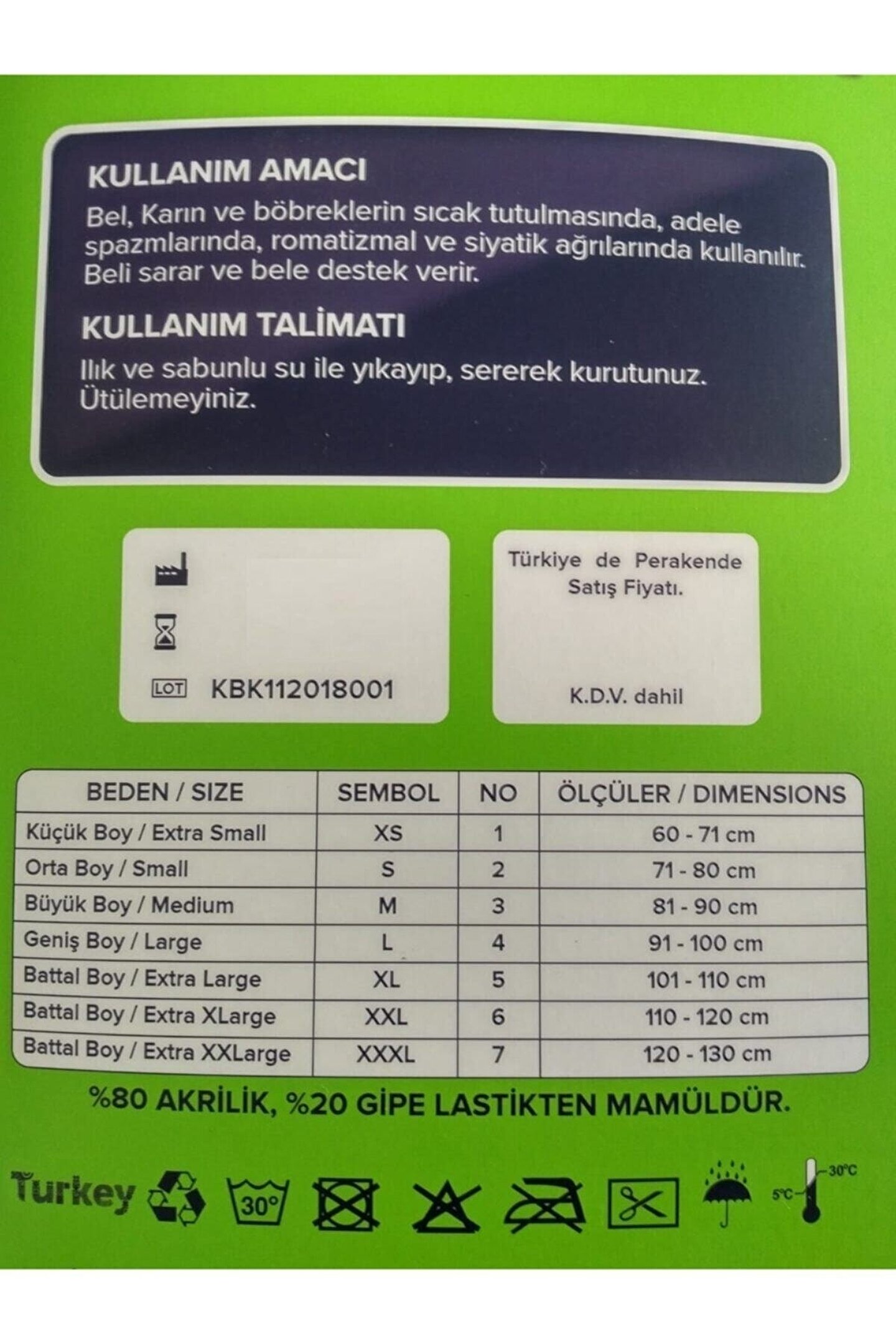KORSE ÖLÇÜLERİ: No:1 XS (Bel:61-70 cm) No:2 S (Bel:71-80 cm) No:3 M (Bel:81-90 cm) No:4 L (Bel:91-100 cm) No:5 XL (Bel:101-110 cm) Kullanım Alanları: Bel, karın ve böbrekleri sıcak tutmak için Adale spazmalarında Romatizmal ve siyatik ağrılarında kullanılır. ; Kullanım Şekli: İç çamaşırı üstüne yukarıdan göbeği ortalayacak şekilde giyilir. ; Yıkama: Ilık ve beyaz sabunlu su ile çitilemeden yıkanır. ; Bir havlu üzerinde kurutulur.;