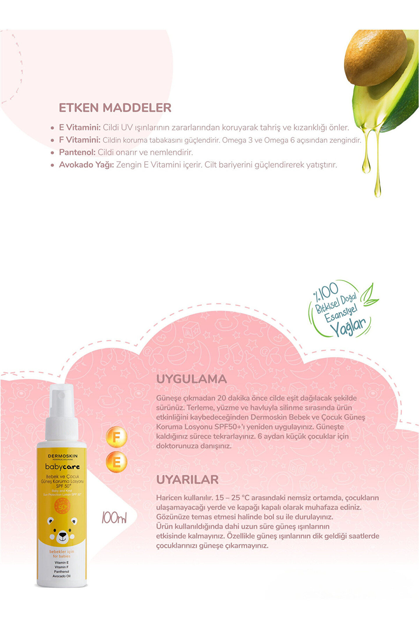 Dermoskin babycare güneş koruma losyonu spf 50+ 100ml;dermoskin babycare güneş koruma losyonu spf50+, uva, uvb filtreleriyle güneşin zararlı etkilerine karşı korur.; Doğal yağlar, e-F vitaminleri ve pantenol ile tahriş ve kızarıklığı önler, cildi onarır ve nemlendirir.;suya, kuma, tere karşı dayanıklıdır.;etken madde özellikleri:;yeni jenerasyon filtreler ile uva’ ya karşı korur.;vitamin e: Cildi uv ışınlarının zararlarından koruyarak tahriş ve kızarıklığı önler.;vitamin f: Cildin koruma tabakasını güçlendirir.; Omega 3 ve omega 6 açısından zengindir.;panthenol: Cildi onarır ve nemlendirir.;avokado yağı: Zengin e vitamini içerir.; Cilt bariyerini güçlendirir.;uygulama;güneşe çıkmadan 20 dakika önce cilde eşit dağılacak şekilde sürünüz.; ;terleme, yüzme ve havluyla silinme sırasında ürün etkinliğini kaybedeceğinden dermoskin baby and kids güneş koruma spf50+ losyonunu yeniden uygulayınız.; ;güneşte kaldığınız sürece tekrarlayınız.; ;6 aydan küçük çocuklar için doktorunuza danışınız.; ;uyarılar;haricen kullanılır.; ;15 – 25 °c arasında nemsiz ortamda, çocukların ulaşamayacağı yerde ve kapağı kapalı olarak muhafaza ediniz.; ;gözünüze temas etmesi halinde bol su ile durulayınız.;ürün kullanıldığında dahi uzun süre güneş ışınlarının etkisinde kalmayınız.; (özellikle güneş ışınlarının dik geldiği saatlerde çocuklarınızı güneşe çıkarmayınız.; ) güneşte gereğinden fazla kalmak sağlık için zararlıdır.