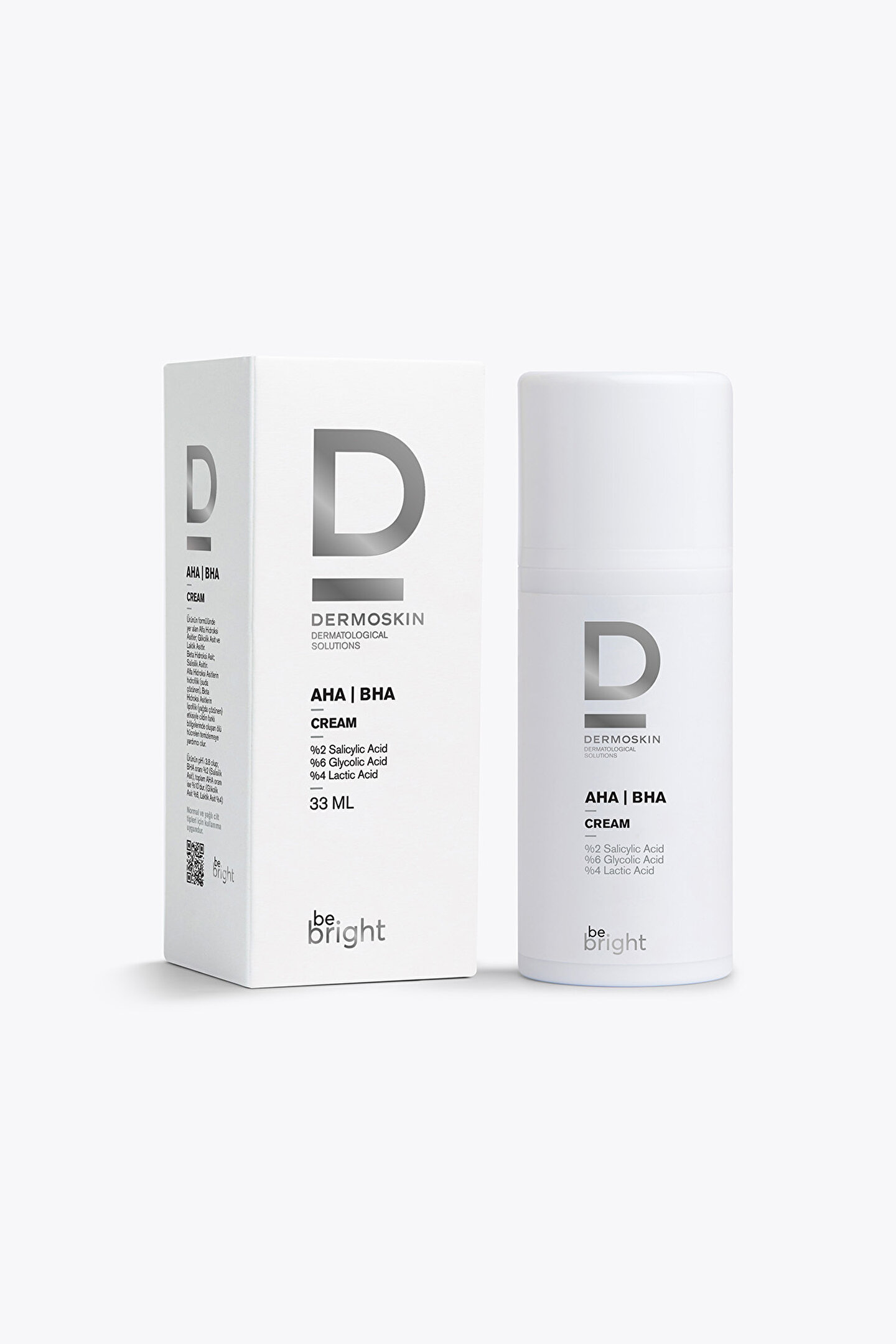 Be Bright AHA/BHA Krem 33 ml Eksfoliasyon işlemi, cildin ölü hücrelerinin atılmasıyla doğal epidermal yenilenme işlemidir.; Ürünün formülünde yer alan güçlü eksfolianlardan Alfa Hidroksi Asitlerin ve Beta Hidroksi Asitin birlikte kullanılması; renk tonu eşitsizlikleri, leke, ince çizgiler, kırışıklıklar, , izleri ve siyah noktaların giderilmesinde, cildin aydınlanması ve gevşeyen cildin elastikiyet kazanmasında tek başlarına uygulanmalarından daha etkindir.; Etken Maddeler; %2 Salicylic Acid (BHA): (Lipofilik) Yağda çözünen ve gözenekleri tıkayan kalıntıları temizler.; %6 Glycolic Acid (AHA): (Hidrofilik) Kısa zincirli Alfa Hidroksi Asit olup soyucu özelliği güçlüdür.; %4 Lactic Acid (AHA): (Hidrofilik) Uzun zincirli Alfa Hidroksi Asit olup nemlendirici özelliği güçlüdür.; Alfa Hidroksi Asitlerin hidrofilik (suda çözünen), Beta Hidroksi Asitlerin lipofilik (yağda çözünen) etkisi cildin farklı bölgelerinde oluşan ölü hücrelerin temizlenmesine yardımcı olur.; İçeriğinde bulunan AHA (Glikolik Asit ve Laktik Asit) ve BHA (Salisilik Asit) kullanım oranları Kozmetik Yasası’nın öngördüğü oranlardadır.; Cilt Tipi Normal ve yağlı ciltlerin kullanımına uygundur.; Karma ve kuru Ciltlerde Nemlendirici ile birlikte cildi alıştırarak belli bir aralıklarla kullanılmalıdır.; UYGULAMA Be Bright Aydınlatıcı Tonik ile temizlenmiş cilde AHA /BHA Krem sadece geceleri uygulanır.; ; Eğer ilk defa böyle bir krem kullanıyorsanız, öncelikle cildinizin yapısının normal veya yağlı bir cilt olması gerekmektedir.; ; Karma veya kuru ciltler, doktor tavsiyesi ve yoğun nemlendiriciyle birlikte kullanabilir.; ; İlk uygulamada, cilt yüzeyindeki ölü hücrelerin atılmasına yardımcı olduğu için ciltte yanma, batma, karıncalanma ve kızarıklık olması çok doğaldır.; Kremi uygulamaya önce haftada 3 gün ile başlayıp, daha sonra gün aşırı uygulayabilirsiniz.; ; Cildiniz alıştıktan sonra her gün en az 12 hafta düzenli olarak uygulamanız önerilir.; UYARILAR Ürün sadece geceleri haricen kullanılır.; 15-25°C arasında oda sıcaklığında, nemsiz ortamda, çocukların ulaşamayacakları yerde ve kapağı kapalı olarak muhafaza ediniz.; Ürünü göz ve göz çevresine yakın uygulamayınız.; Gözünüze temas etmesi halinde bol su ile durulayınız.; Foto hasardan cildin korunması için, gündüz kapatıcı olarak Be Bright SPF 50+ Likit Fondöten veya Dermoskin Ultra Face Protection SPF 97 Krem kullanılması önerilir.