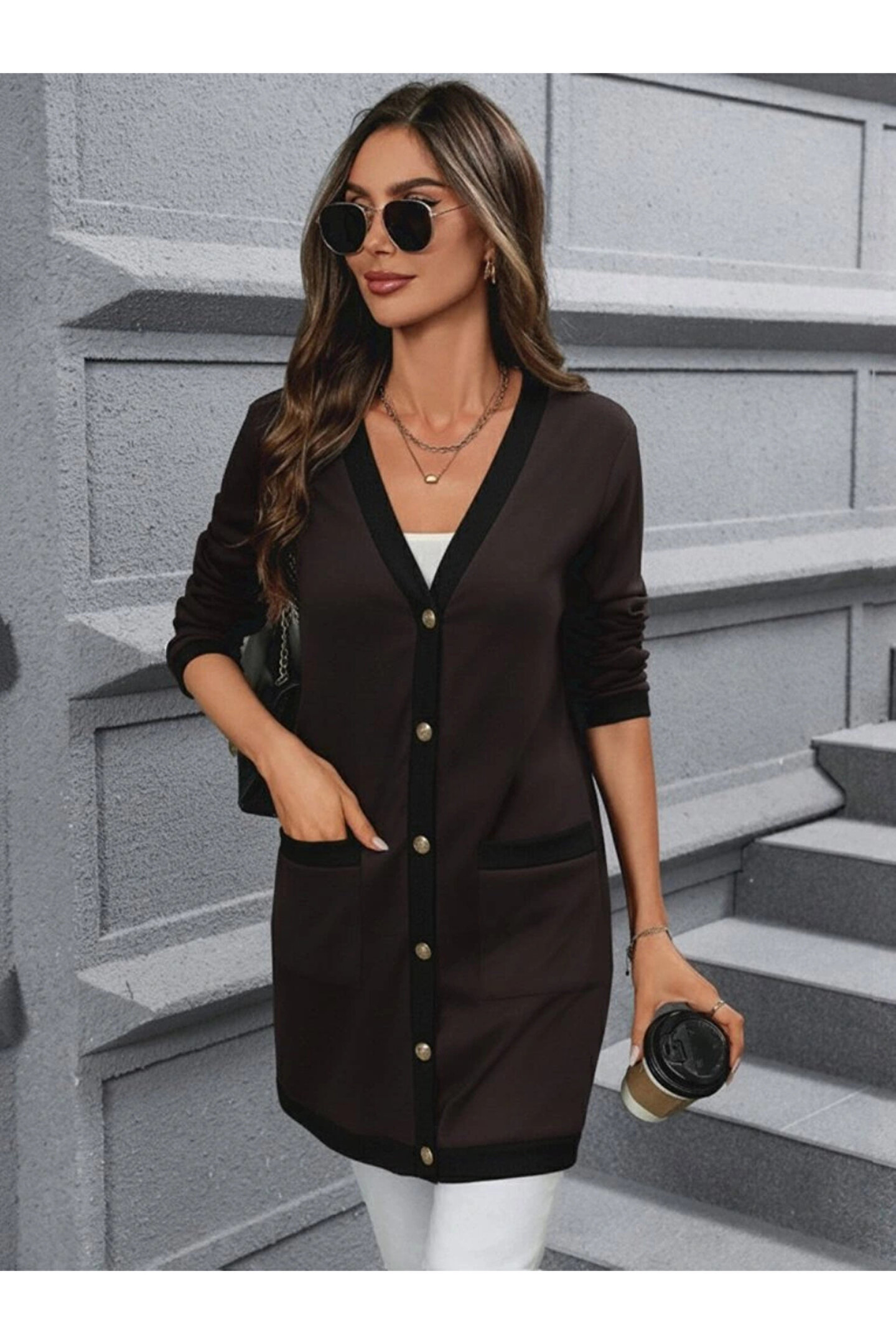 Kadın Uzun Kollu Cepli önden Düğmeli Uzun Modal Ceket Hırka
