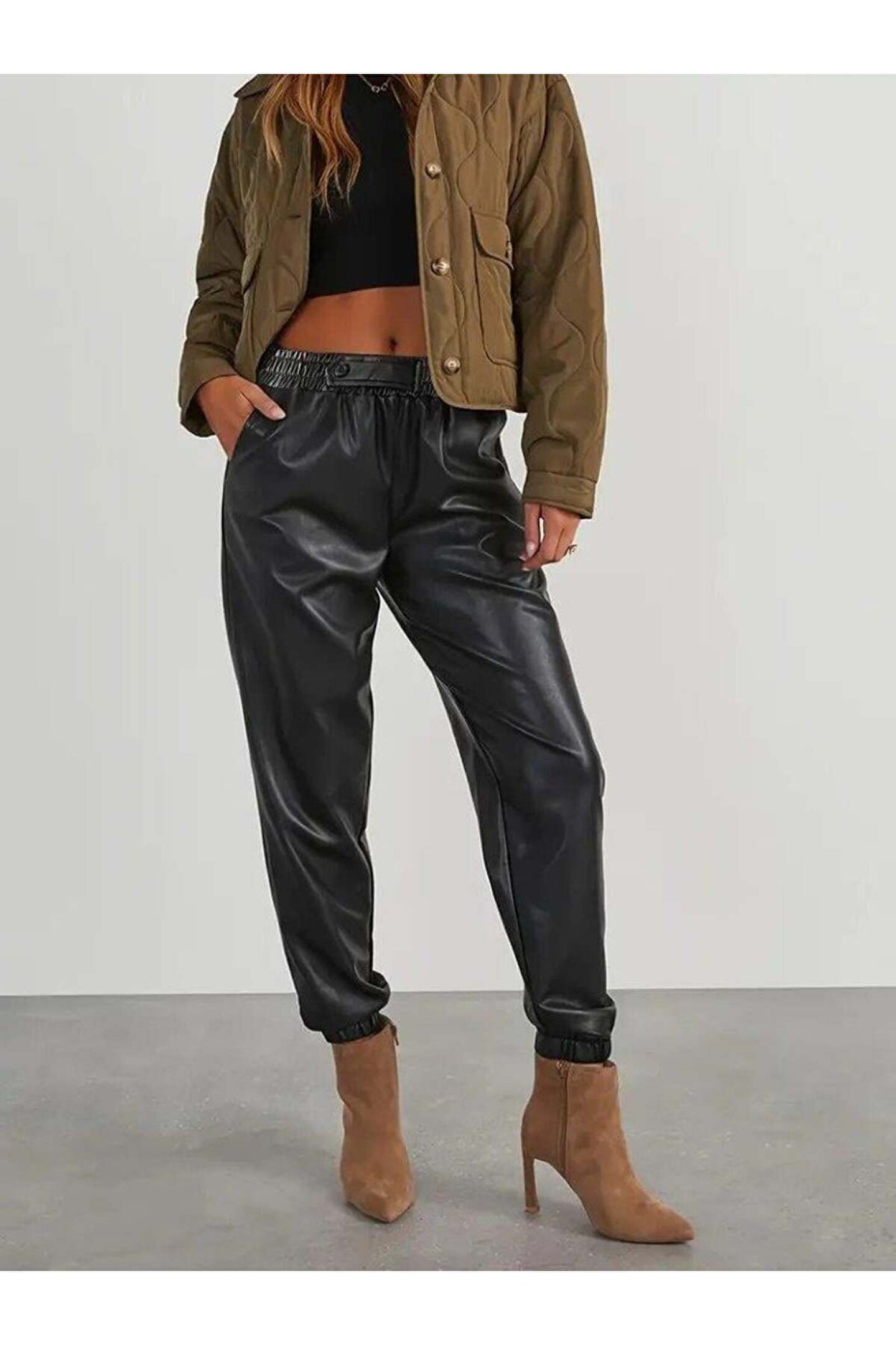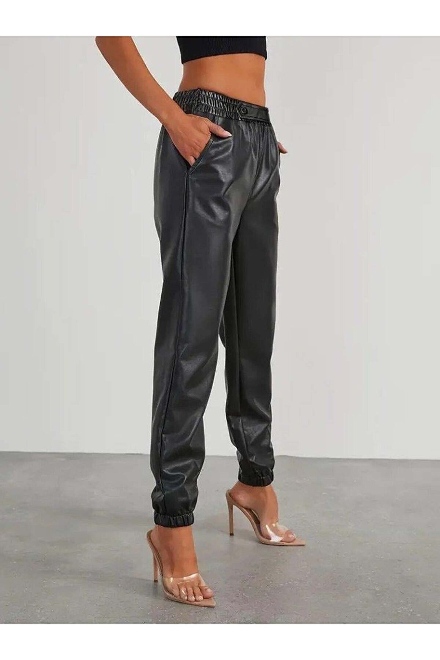 Kadın Yüksek Bel Lastikli önü Düğmeli Deri Pantolon