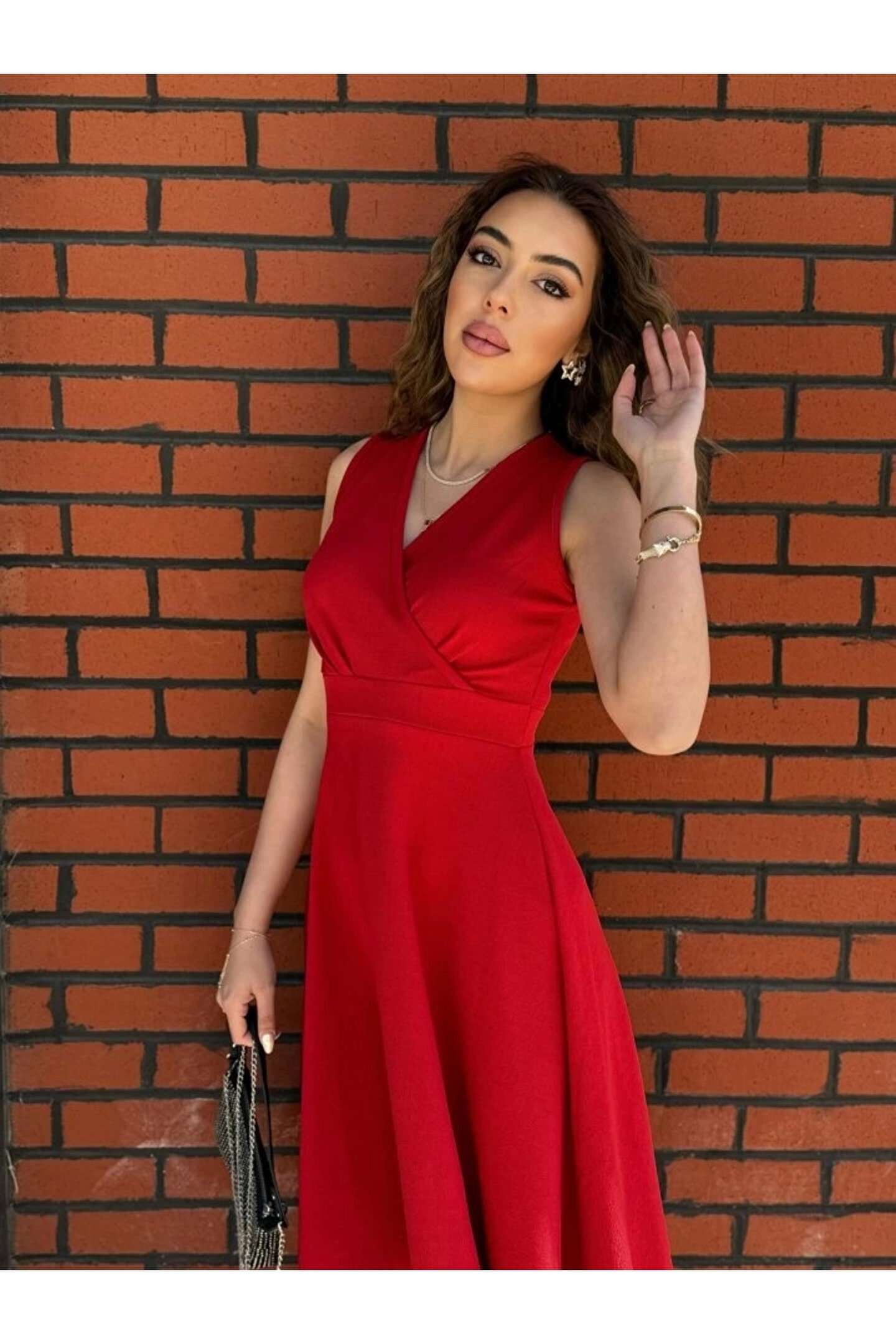 Kadın Ithal Krep Kumaş Kruvaze Yaka Eteği Kloş Kolsuz Mini Elbise