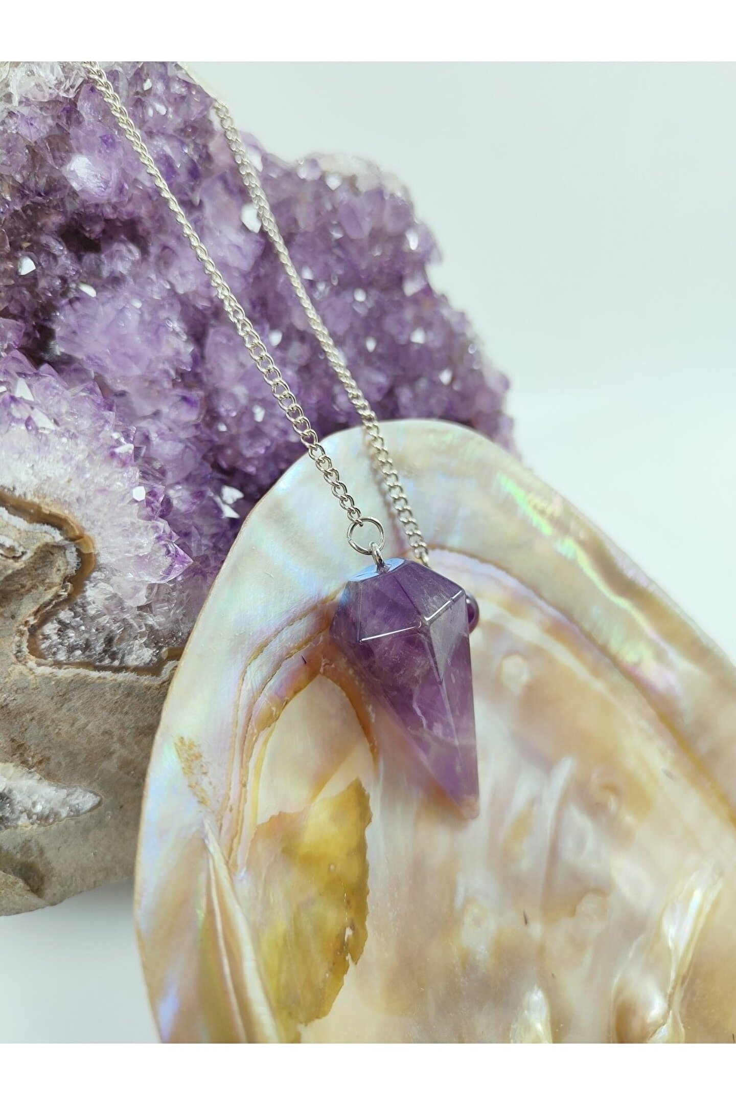 Enerji çalışmalarında kullanılan bir üründür, kolye değildir. ; Doğal taş: Ametist. ; Ölçüleri ortalama 38x18 mm. ; Ağırlık ortalama 10-12 gram. ; Zincir ortalama 15-20 cm uzunluğundadır ve zincir fiyata dahildir. ; -----özellikleri----- -doğal bir sakinleştiricidir. ; -ruhsal farkındalığı arttırır ve meditasyonu geliştirir. ; -strese karşı koruyucudur. ; -dinlendirici uyumayı, dinç kalkmayı sağlar. ; -kanser oluşumunu engeller. ; -kan şekerini dengeler. ; -sindirim sistemini düzenler. ; -ortamdaki olumsuz enerjiyi olumlu enerjiye çevirir. ; -zihin için oldukça etkilidir. ; -bedeni dinç tutar. ; -eklem ağrılarını tedavi ederek daha rahat hareket etmeyi sağlar. ; Tüm ürünlerimiz 30 yıllık doğal taş şirketimiz tarafından orjinal ve doğallık sertifikalarıyla gelir...;