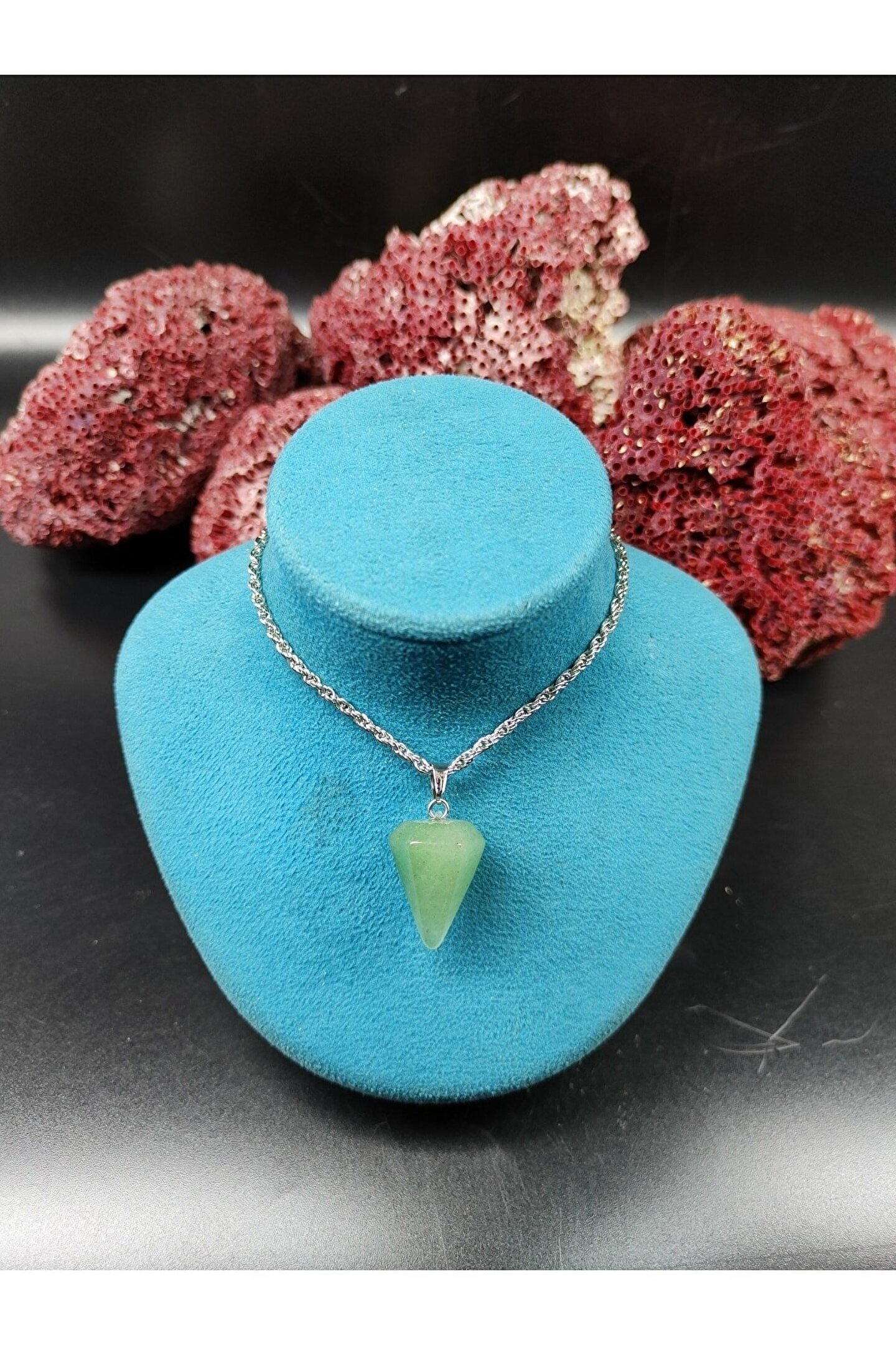 Kolye zincirleri gümüş kaplamadır. ; Kullanım önerisi olarak kolyenin kimyasal maddelerle (şampuan, havuz kloru vs.) temasından kaçınılmalıdır aksi halde doğal taşın yapısında bozulmalar görülebilir. ; -----özellikleri ----- -fiziksel gücü ve canlılığı arttırır. ; -bedendeki eril ve dişil enerjiyi dengeler. ; -yüksek tansiyon için şifalıdır. ; -sakinleştirici, dinginlik verici özelliğe sahiptir. ; -huzursuzlukları giderir. ; -kolestrolü normal seviyesine düşürür. ; -enerjisiyle bireyi motive eder. ; Tüm ürünlerimiz 30 yıllık doğal taş şirketimiz tarafından orjinal ve doğallık sertifikalarıyla gelir...;