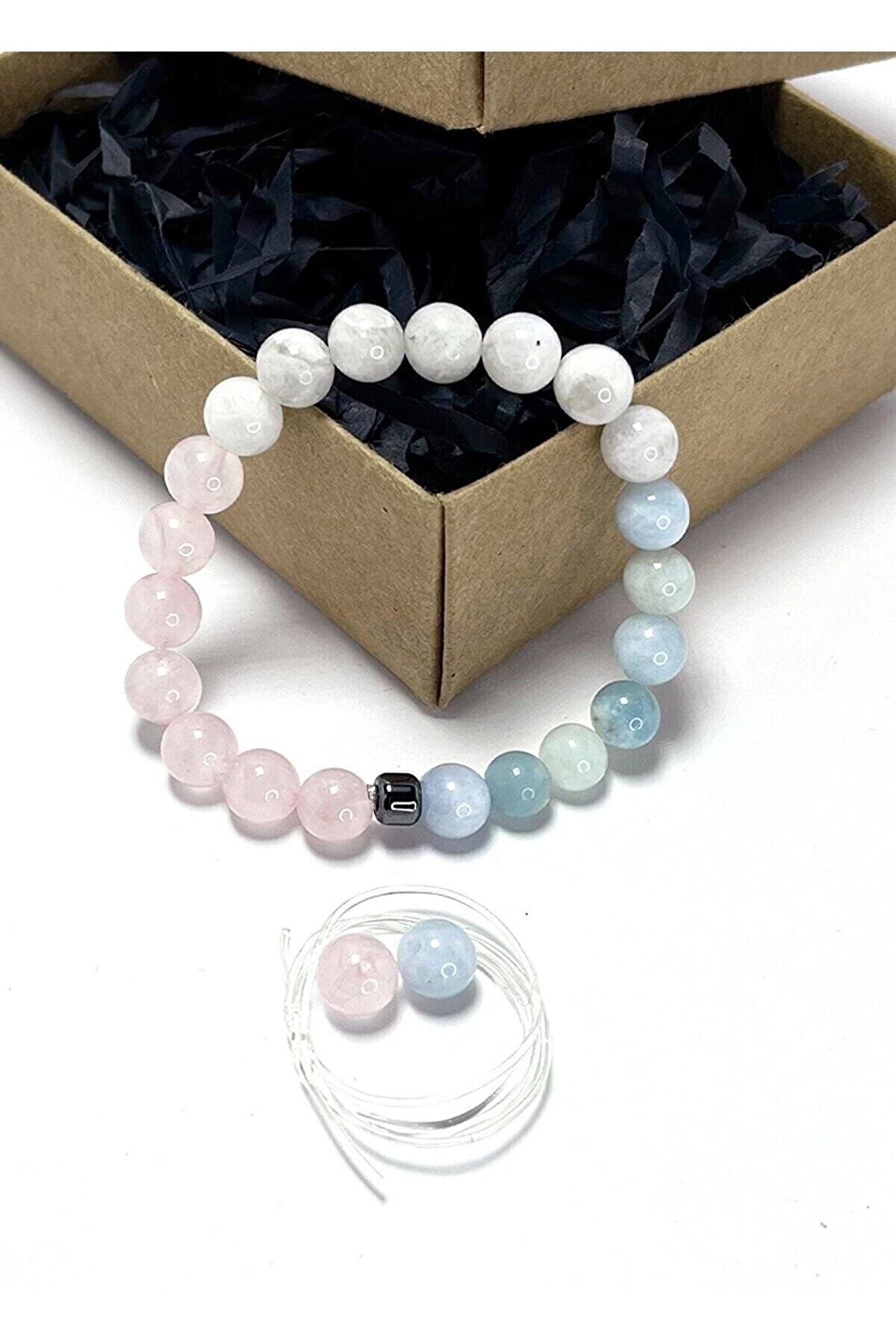 Doğal taş kullanımı sayesinde her bileklik benzersiz ve otantik bir görünüm sunar; Akuamarin, pembe kuvars ve ay taşı gibi değerli taşların birleşimiyle sevgi ve şefkati simgeler; 8 mm boyutundaki taşlar, bileklikte zarif bir doku oluşturarak dikkat çekici bir aksesuar haline gelir; Doğal taş materyali ile hem dayanıklılık hem de estetik bir parlaklık sağlar;