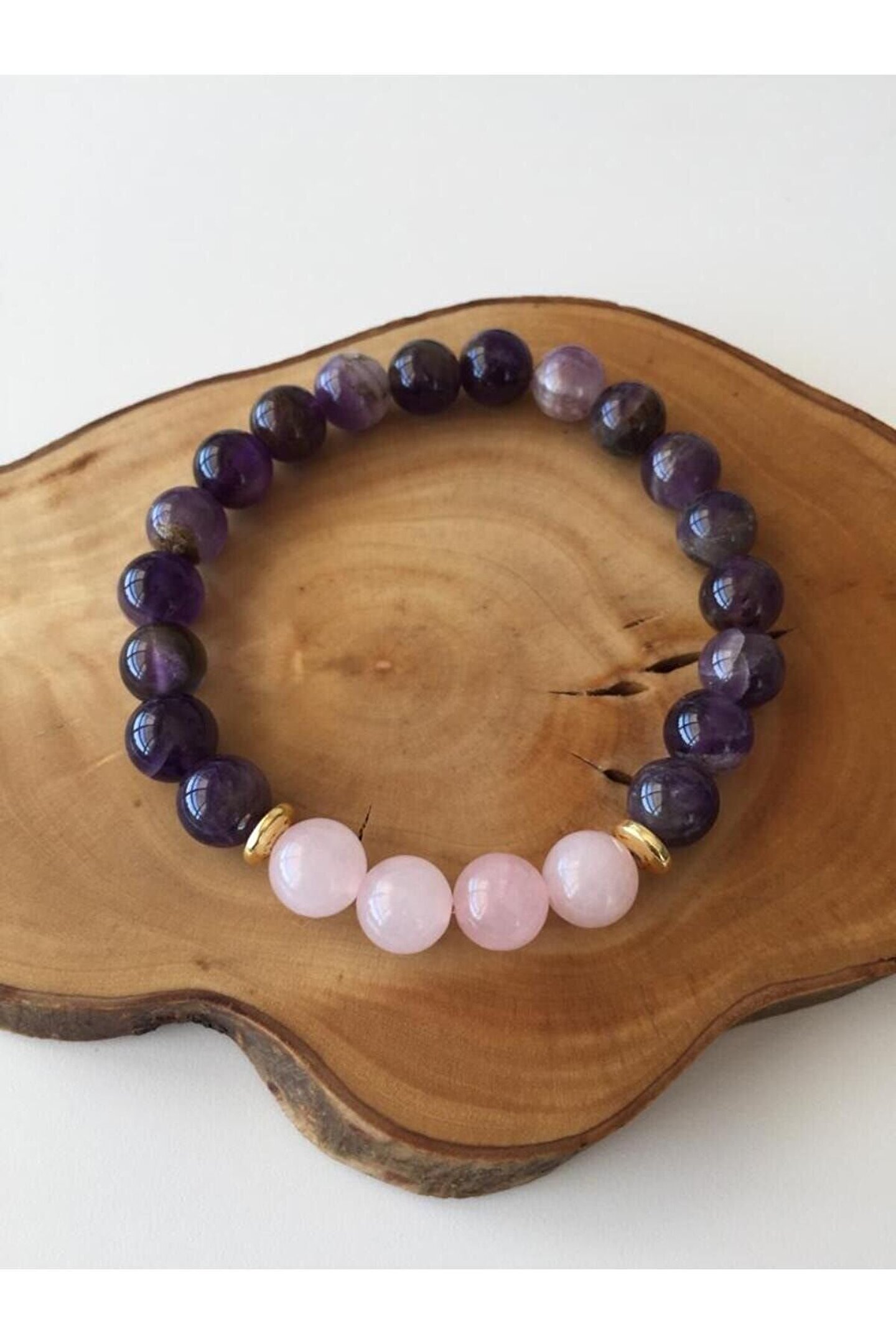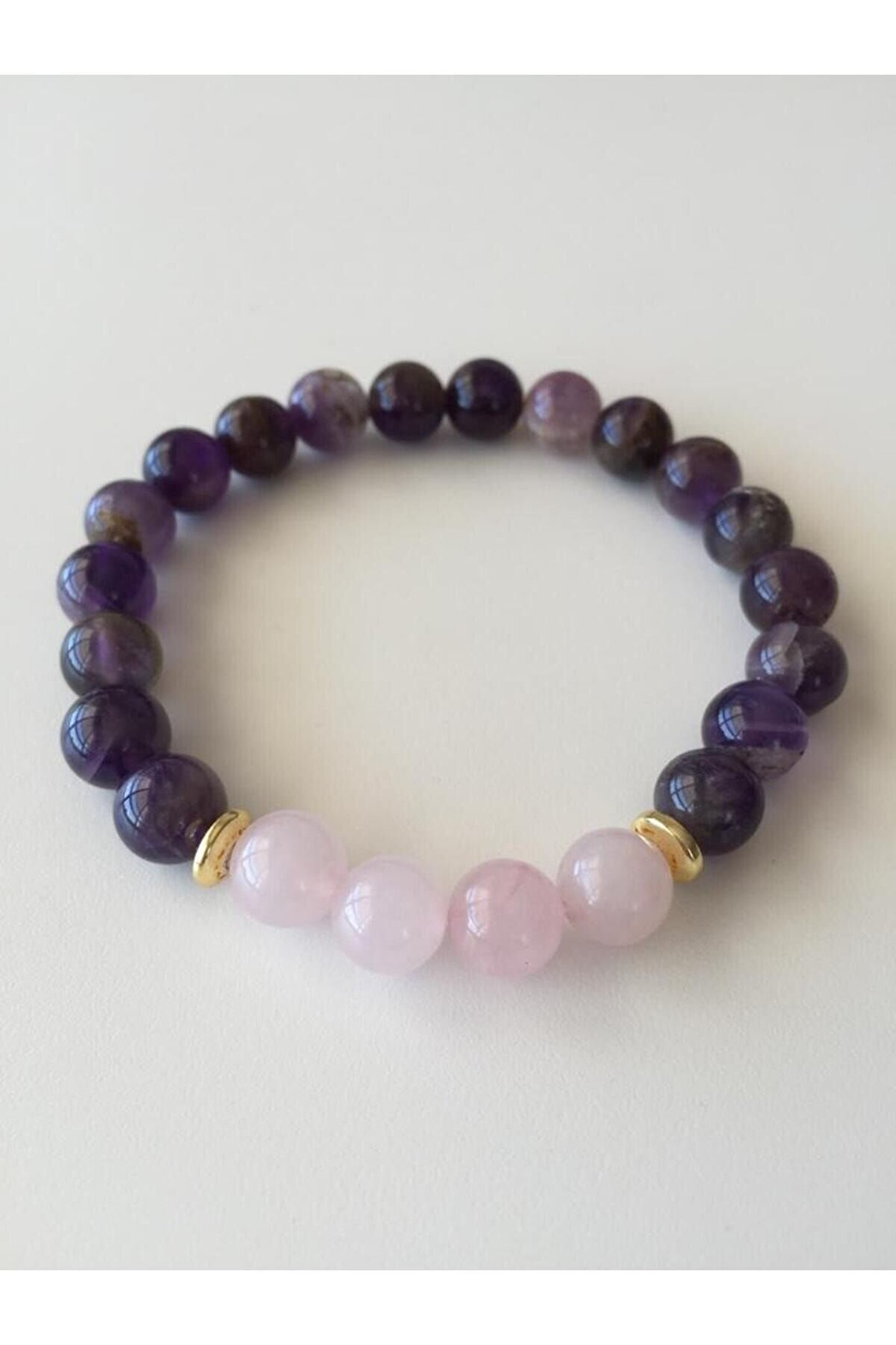 Bu üründe kullanılan Doğal taş Ametist ve Pembe Kuvars takriben 8mm çapındadır. ; Elastik yapıda olduğu için her yaşa uygundur. ; Doğal taşları parfüm,saç spreyi ,deterjan,krem, sabun vb. ; kimyasal ürünlerden koruyunuz. ; Aksi takdirde doğal taş etkinliğini kaybedecektir. ; Doğal taşınızı 10-15 gün aralıklarla toprakta 24 saat bekleterek temizleyebilirsiniz. ; Ametist son derece güçlü ve koruyucu bir taştır. ; Çevresindeki enerjileri sevgiye dönüştürür, ataklara karşı koruyucudur, Doğal bir sakinleştiricidir. ; Strese karşı korur. ; Meditasyon taşıdır. ; Ametist kristali güçlü şifa ve arındırma özelliklerine sahiptir. ; Bağımlılıkları yok eder.Zihin için son derece faydalıdır. ; Farkındalığı arttırır. ; Odaklanmayı kuvvetlendirir, zihinsel dağınıklığı iyileştirir. ; Ametist karar alma mekanizmasını da çalıştırır, sağduyu ve iç görü sağladığı gibi fikirleri hayata geçirme açısından da netlik sağlar. ; Pembe kuvars Zihinsel konsantrasyonu arttırdığı bilinir. ; Baş ağrılarını hafifletici etkileri vardır. ; Radyosyonu toplayıcı etkileri vardır. ; Çevrede oluşan negatif enerjiyi yok eder ve pozitif enerjiye çevirir.;