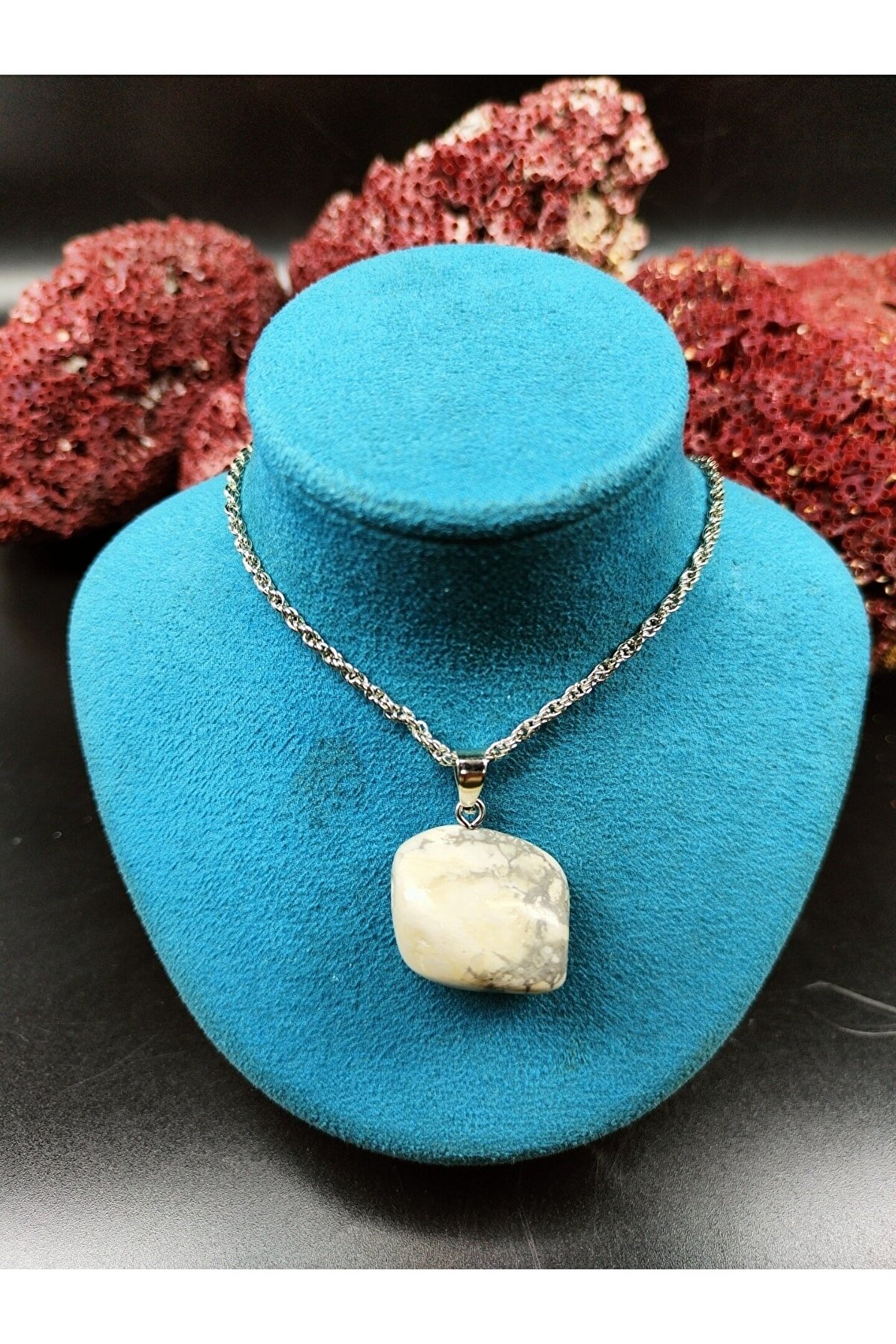 Doğal taş kullanımı sayesinde her kolye benzersiz ve otantik bir görünüm sunar; Sertifikalı havlit taşı, kalite ve güvenilirlik açısından öne çıkar; 47 cm uzunluğundaki zincir ile hem günlük kullanım hem de özel günler için ideal bir aksesuar seçeneği sağlar;