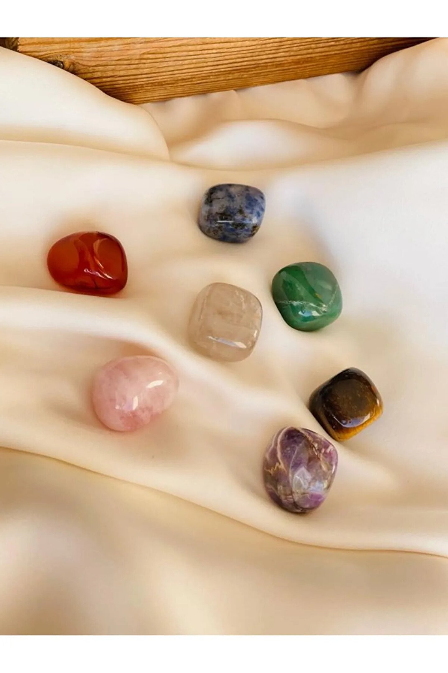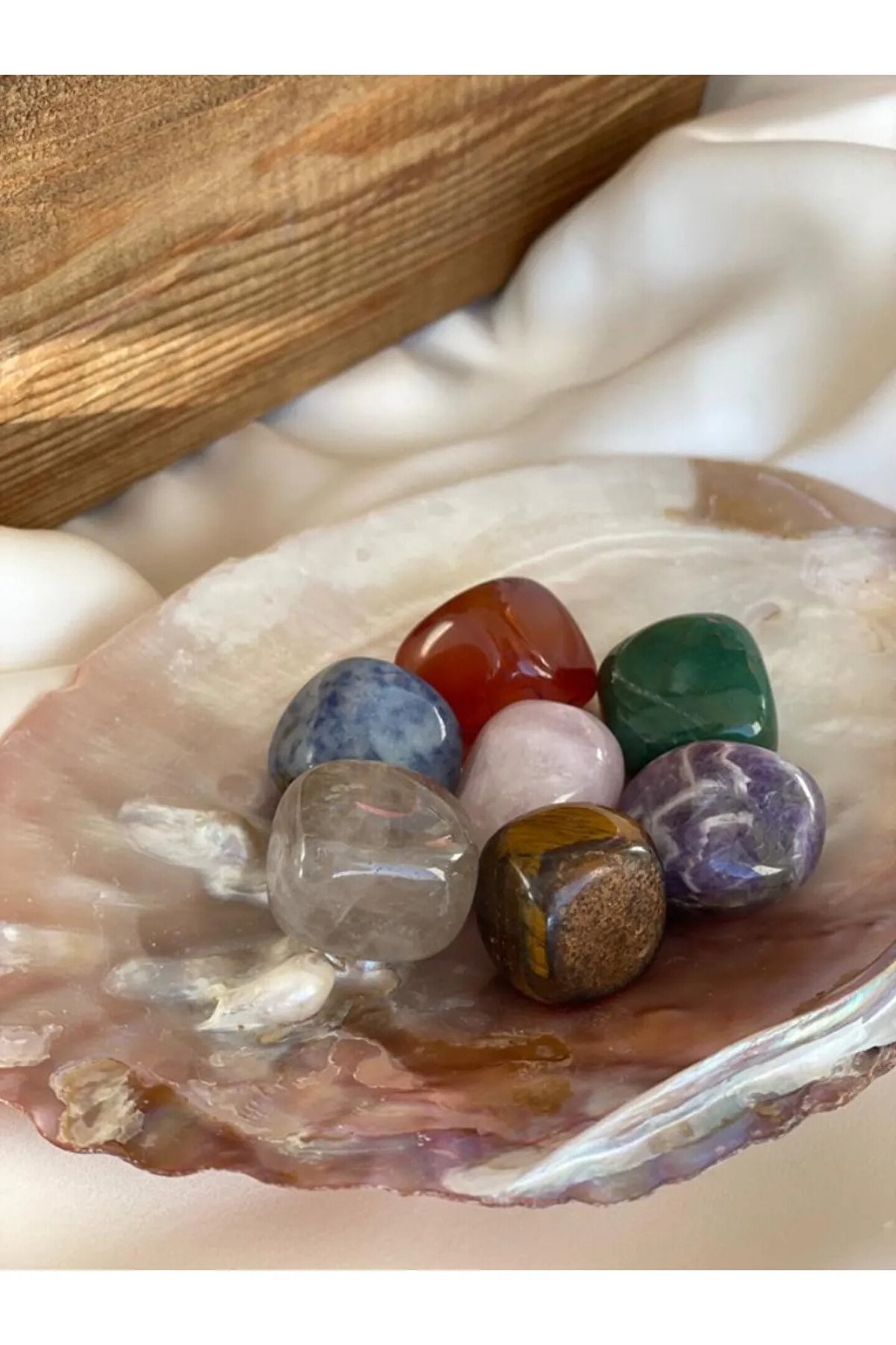 İstiridye Tabağında 7 li Çakra Seti Tepe Çakra Ametist Üçüncü Göz Sodalit Boğaz Çakrası Aventruin Kalp Çakrası Pembe Kuvars Solar Plekus Dumanlı Kuvars Sakral Çakra Kaplangözü Kök Çakra Kırmızı Akik