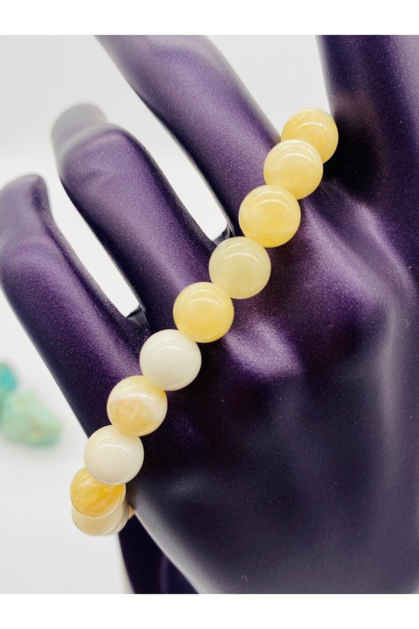 Doğal kalsit taşı kullanılarak üretilmiş, her bir bileklik benzersiz ve özgün bir tasarıma sahiptir; Doğal taş materyali sayesinde, bileklik hem şık hem de doğayla iç içe bir görünüm sunar; 8 mm kalınlığındaki bileklik, rahat bir kullanım sağlarken zarif detaylarıyla dikkat çeker; Kalsit taşı, bilekliğe doğal bir parlaklık kazandırarak her türlü kıyafetle uyum sağlar;
