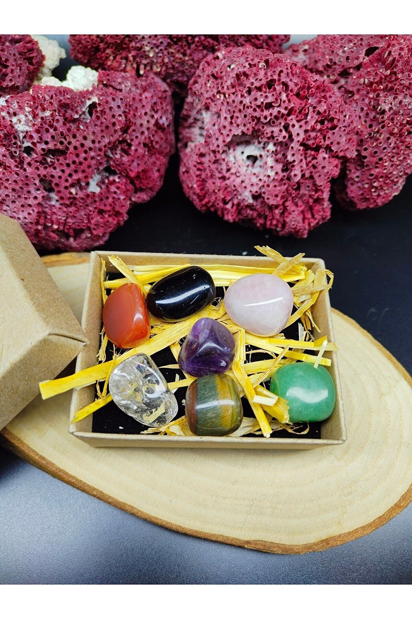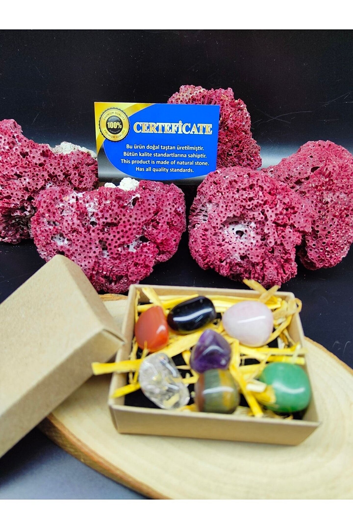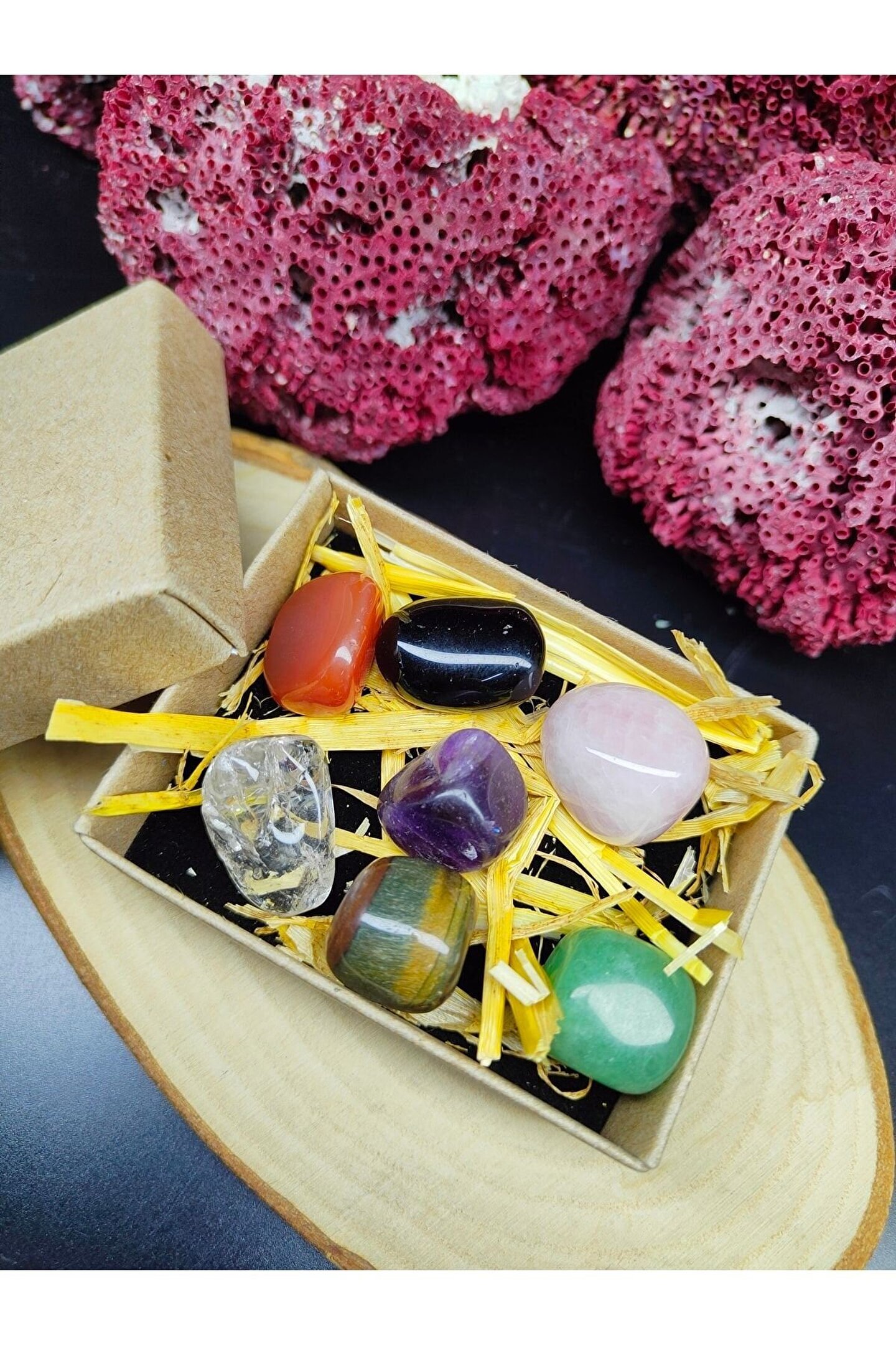 (GÖRSELDE YER ALAN TOPLAM YEDİ ADET TAŞ GÖNDERİLECEKTİR, SETİN TOPLAM AĞIRLIĞI 60-70 GRAM ARASINDA DEĞİŞMEKTEDİR YANİ TAŞ BAŞINA ORTALAMA 8-10 GRAM BANDINDADIR.; ; TAŞLAR GERÇEK DOĞAL TAŞ OLUP ŞEKİLSEL OLARAK DEĞİŞİKLİK GÖSTEREBİLİR.; ; ÜRÜN GÖNDERİMİ GÖRSELDE MEVCUT OLAN ÖZEL SİYAH KUTU İÇERİSİNDE YAPILACAKTIR.; ) -----İÇİNDEKİLER----- -Ametist -Pembe Kuvars -Oniks -Kaplan gözü -Aventurin -Kristal Kuvars -Akik Bütün çakraları açarak kişinin fiziksel ve zihinsel durumunu dengede tutar.; ; Kişiyi huzurlu ve mutlu hissettirir.; ; Kişiyi motive eder ve hayatı sevmesini sağlar.; ; Taşların enerjisini temizlemek için akan suda yıkamanız ya da toprağın altında 24 saat boyunca bekletmeniz yeterli olacaktır.; ; TÜM ÜRÜNLERİMİZ 30 YILLIK DOĞAL TAŞ ŞİRKETİMİZ TARAFINDAN VE DOĞALLIK SERTİFİKALARIYLA GELİR.;