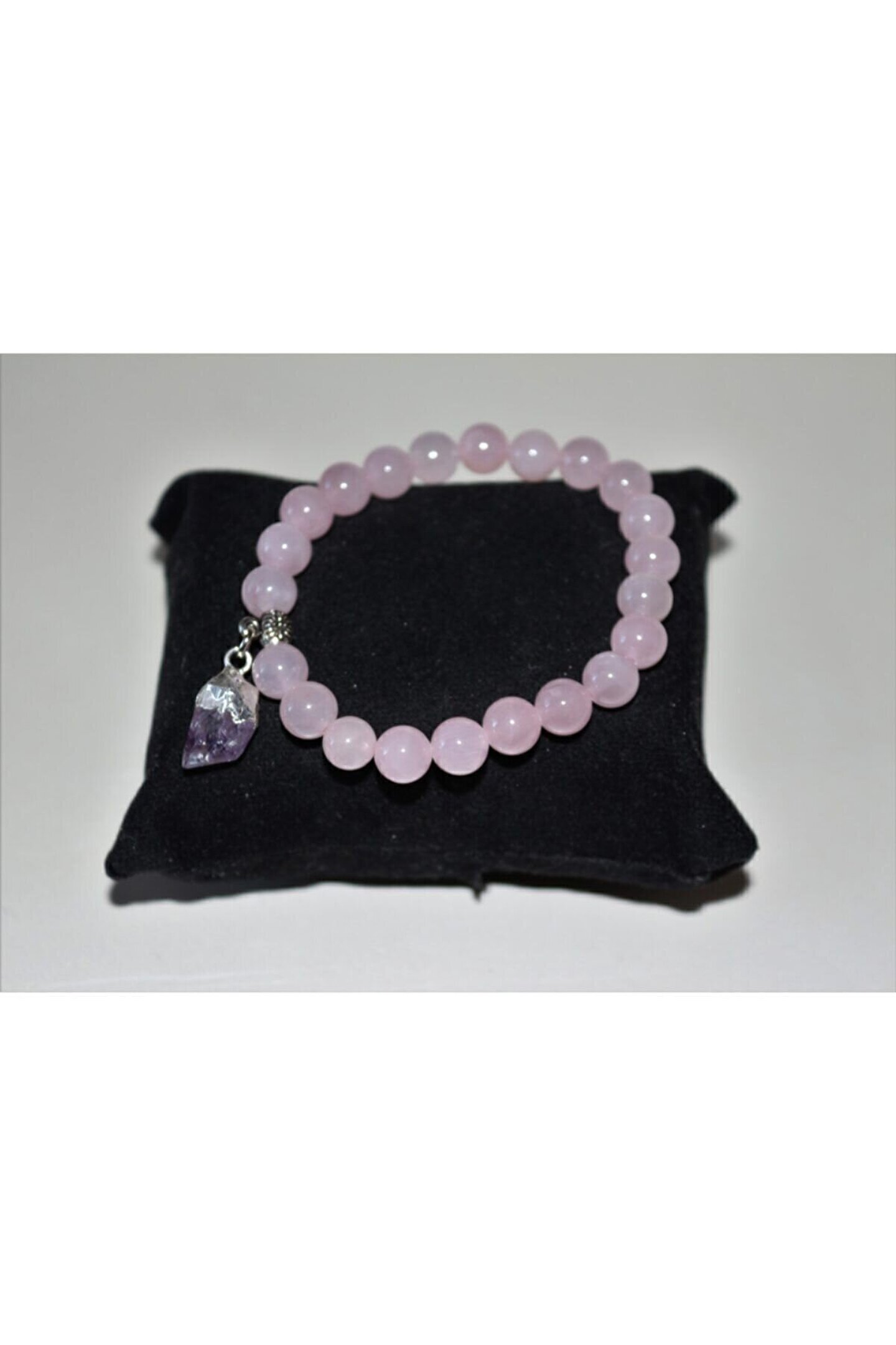 Pembe kuvars taşı, kalbi hastalık ve travmalara karşı korur.; Mutluluk duygusu verir.; Ametist ile uyumlu kullanıldığı zaman bir şekilde enerjiyi arttırır ve aşk duygusunu güçlendirir.; Burçları; Koç, boğa, ikizler, yengeç, başak, Uyumlu olduğu çakra; Boğaz çakrası ve 4. Kalp çakrası; Elastik yapıda olduğu için yetişkin kadın ve erkekler için uygundur, bu üründe kullanılan işlenmemiş ametist taşı şekli küçük farklılıklar gösterebilir Bu üründe kullanılan doğal taş: Pembe kuvars taşı, ametist taşı Bu üründe kullanılan doğal taş boyutu: Ortalama çap : 8 mm; Ortalama uzunluk : 19 cm ( tek sıra );