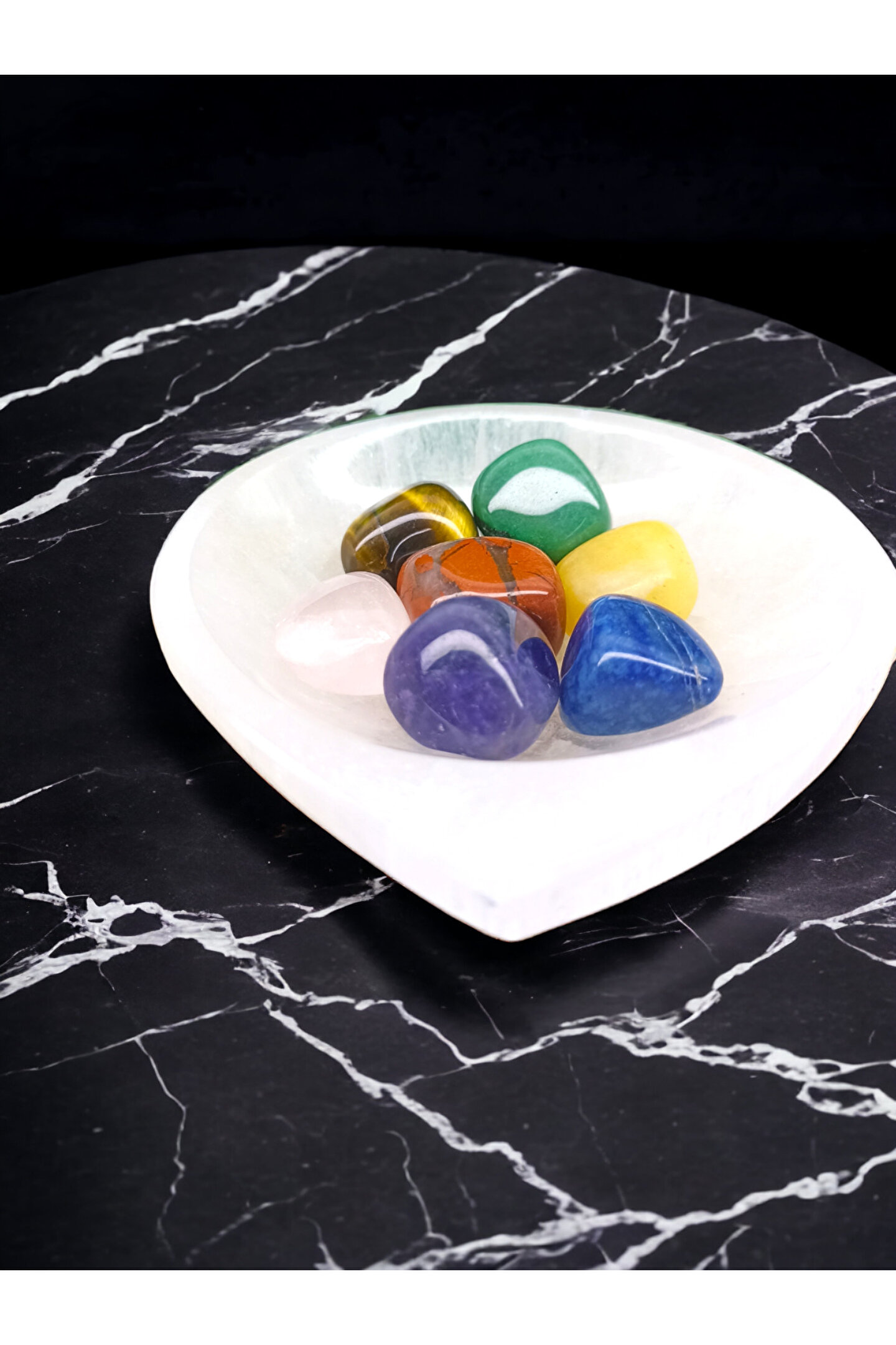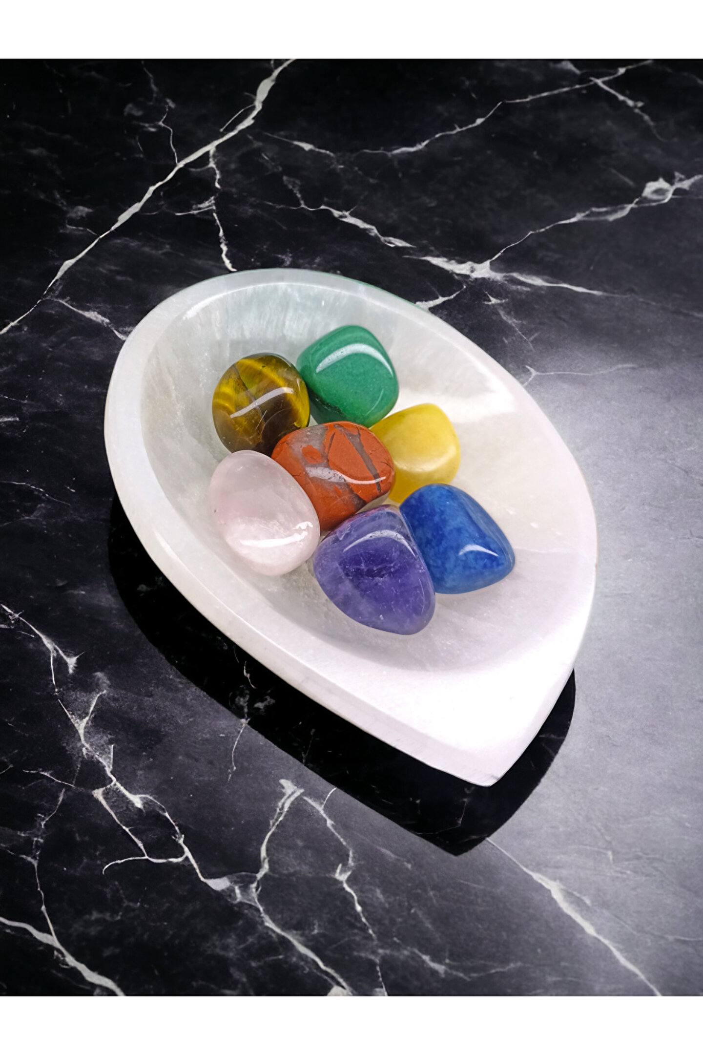 DOĞAL TAŞ CENNETİ Selenit Kase Arındırma Taşı VE ÇAKRA SET TIMBIL (ASA)(SERTİFİKALI)
