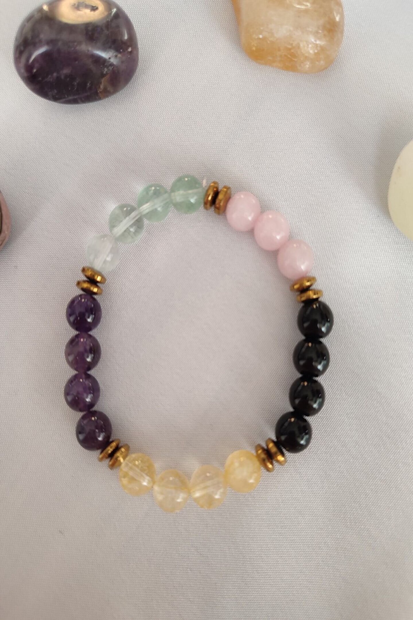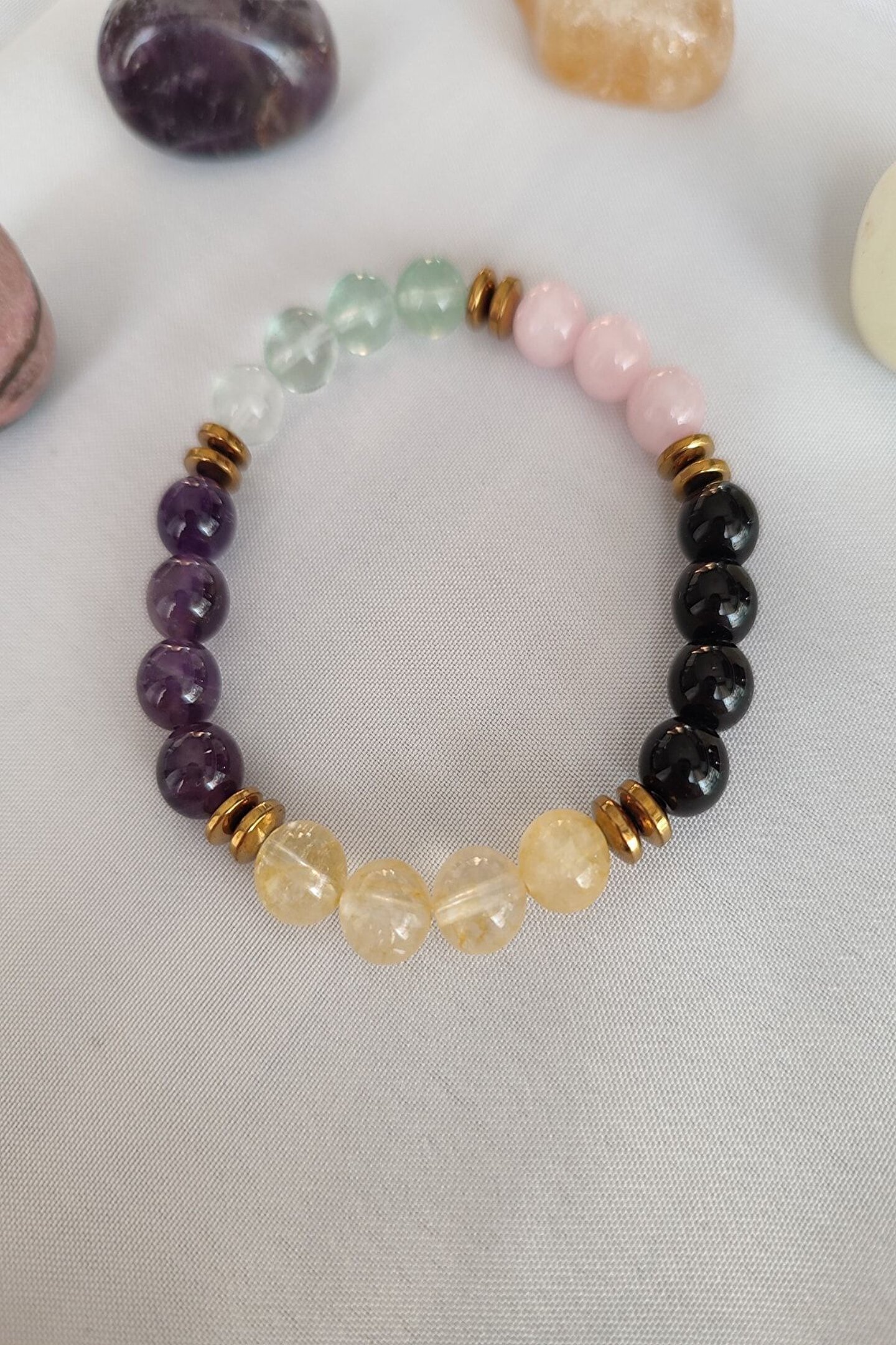 Doğal taş bileklik, şıklığınızı tamamlayacak zarif bir aksesuardır; Sertifikalı florit, ametist, sitrin, oniks ve pembe kuvars gibi değerli taşlarla süslenmiştir; Hem günlük kullanım hem de özel günler için ideal bir seçimdir; Hem estetik hem de enerji açısından zengin olan bu bileklik, stilinizi yansıtırken pozitif enerjiyi de beraberinde getirir; Hem kendiniz için hem de sevdiklerinize hediye olarak tercih edebileceğiniz eşsiz bir hediye seçeneğidir;