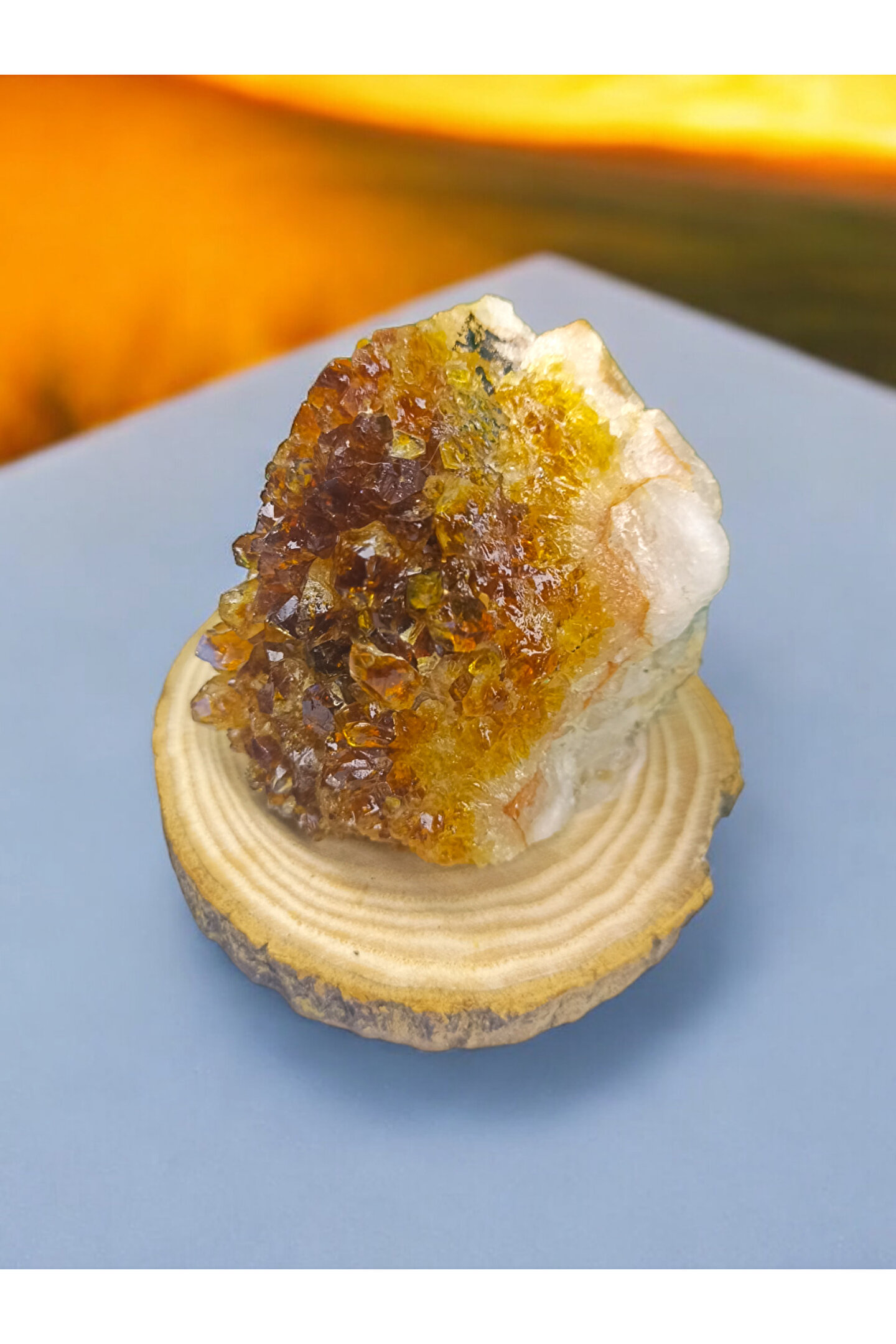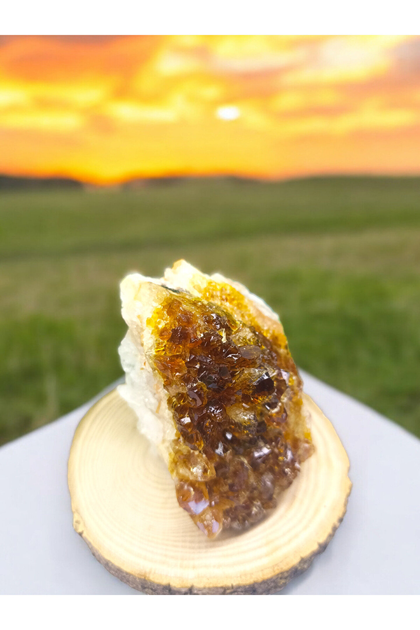 Doğal taş materyali ile üretilmiş, doğanın saf güzelliğini evinize taşıyan bir dekoratif obje; Sertifikalı ve kaliteli bir ürün olup, Sitrin jeot ham doğal taş mineralinin özgün özelliklerini yansıtır; Para taşı olarak da bilinen Sitrin, zenginlik ve refah getirdiği inancıyla evinizde şans ve bereketi simgeleyecek bir aksesuar; 200 gram ağırlığında ve 5 cm boyunda olan bu şık obje, hem dekoratif hem de anlamlı bir hediye seçeneği sunar;