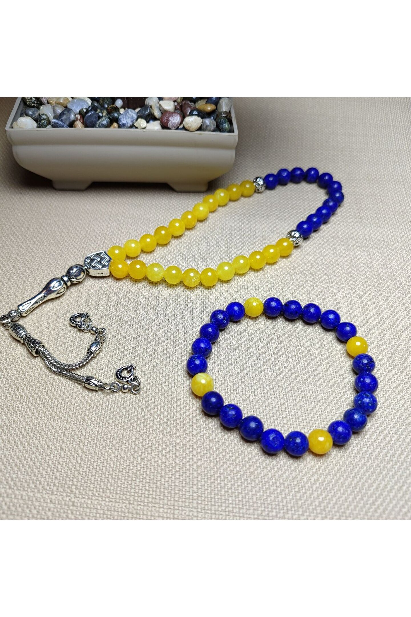 Doğal akik taşı kullanılarak tasarlanmış, benzersiz ve otantik bir aksesuar.; El yapımı bilezik, her biri farklı dokunuşlarla hazırlanmış ve kişisel tarzınıza özel bir görünüm sunar.; Akik taşı, doğanın sunduğu renk ve desen çeşitliliği ile göz alıcı bir estetik sergiler.; Taş bileşeni sayesinde bilekliğin dayanıklılığı artırılmış, uzun süreli kullanım için idealdir.; Özel tasarımıyla dikkat çekici bir aksesuar olarak günlük giyimde farkınızı ortaya koyun.;