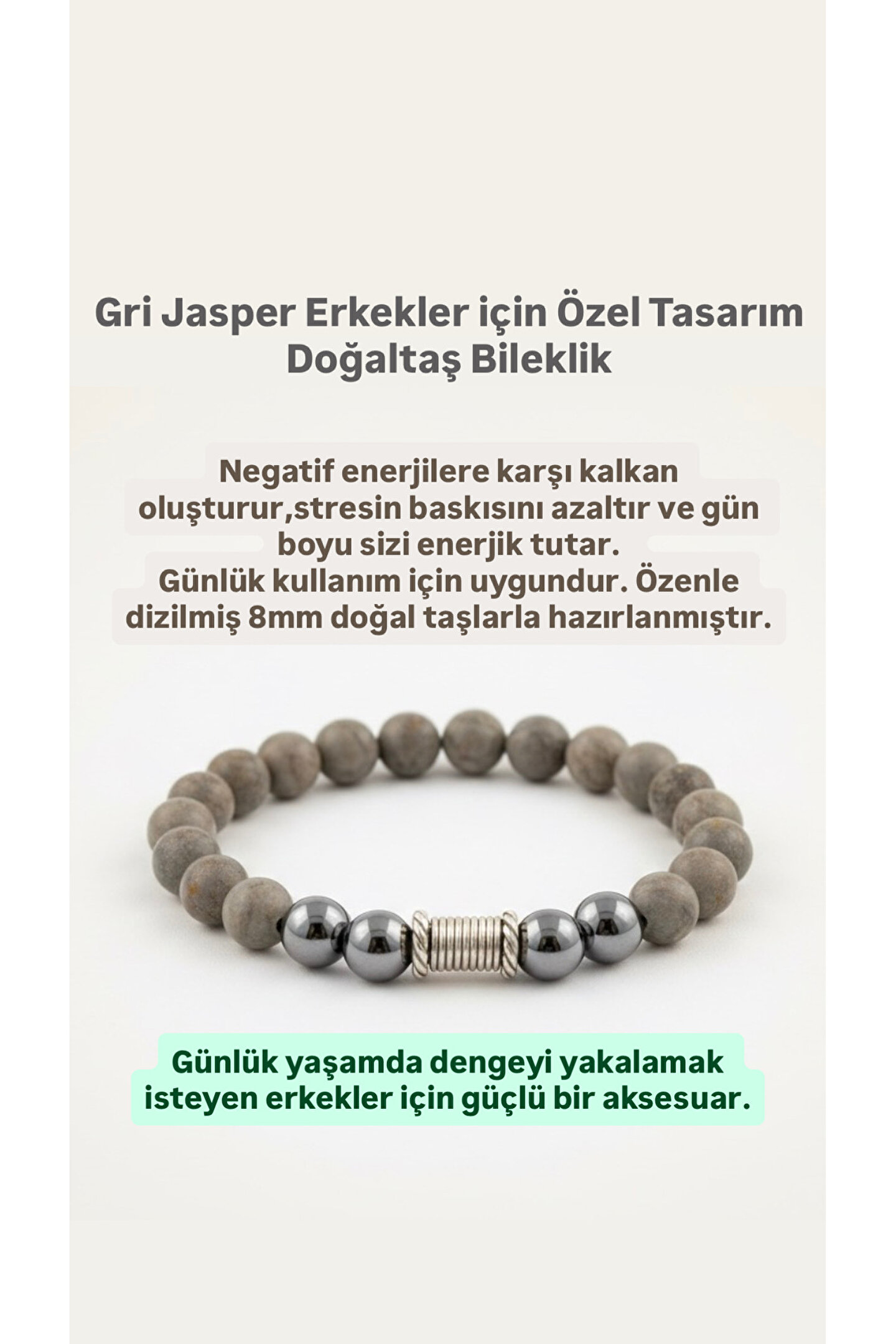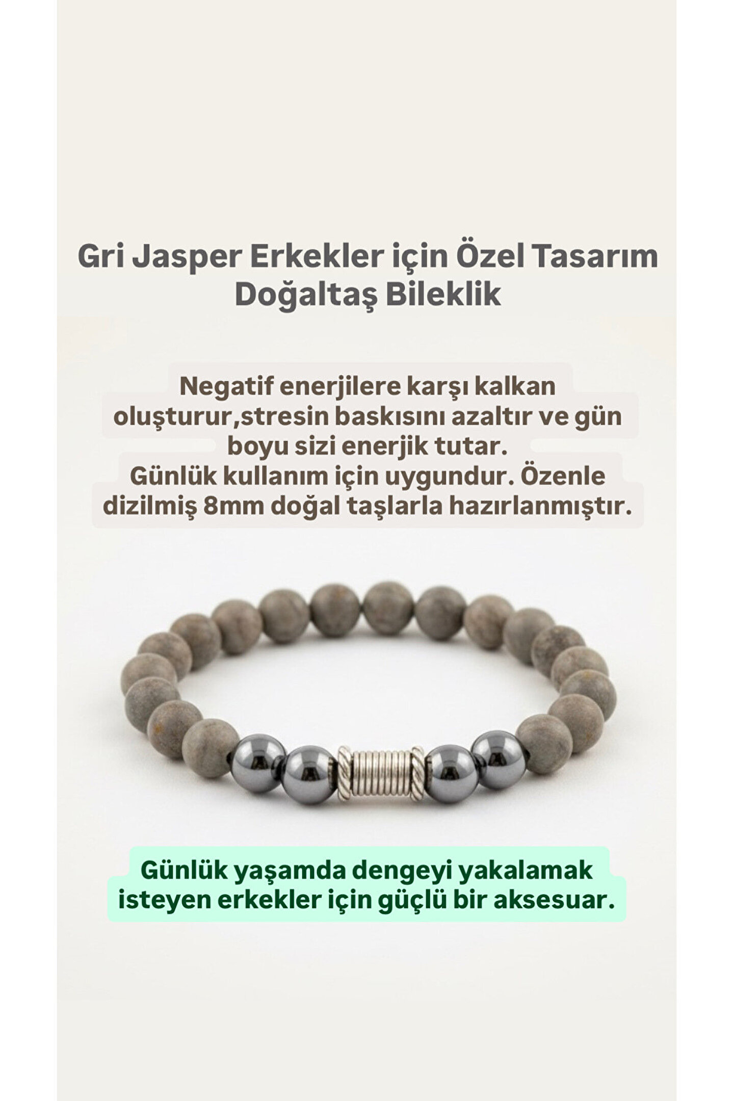 Gri Jasper Doğaltaşı :stresin baskısını azaltır ve gün boyu sizi enerjik tutar.; Günlük kullanım için uygundur.; Özenle dizilmiş 8mm doğal taşlarla hazırlanmıştır.; HEDİYE PAKETİNDE GÖNDERİLİR.