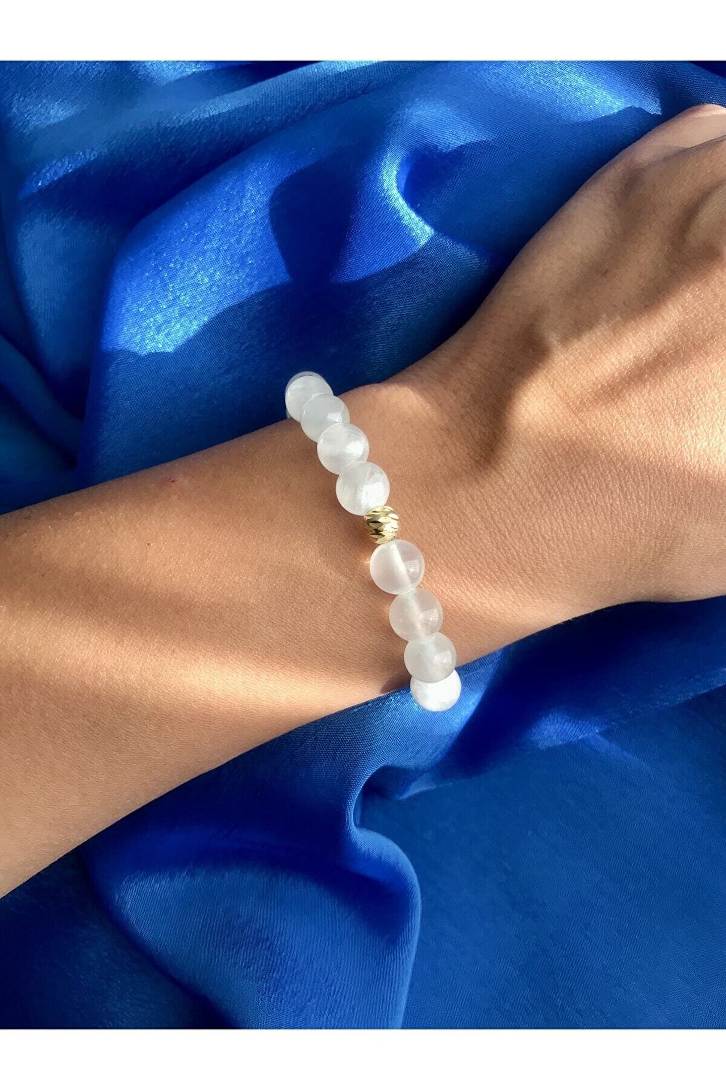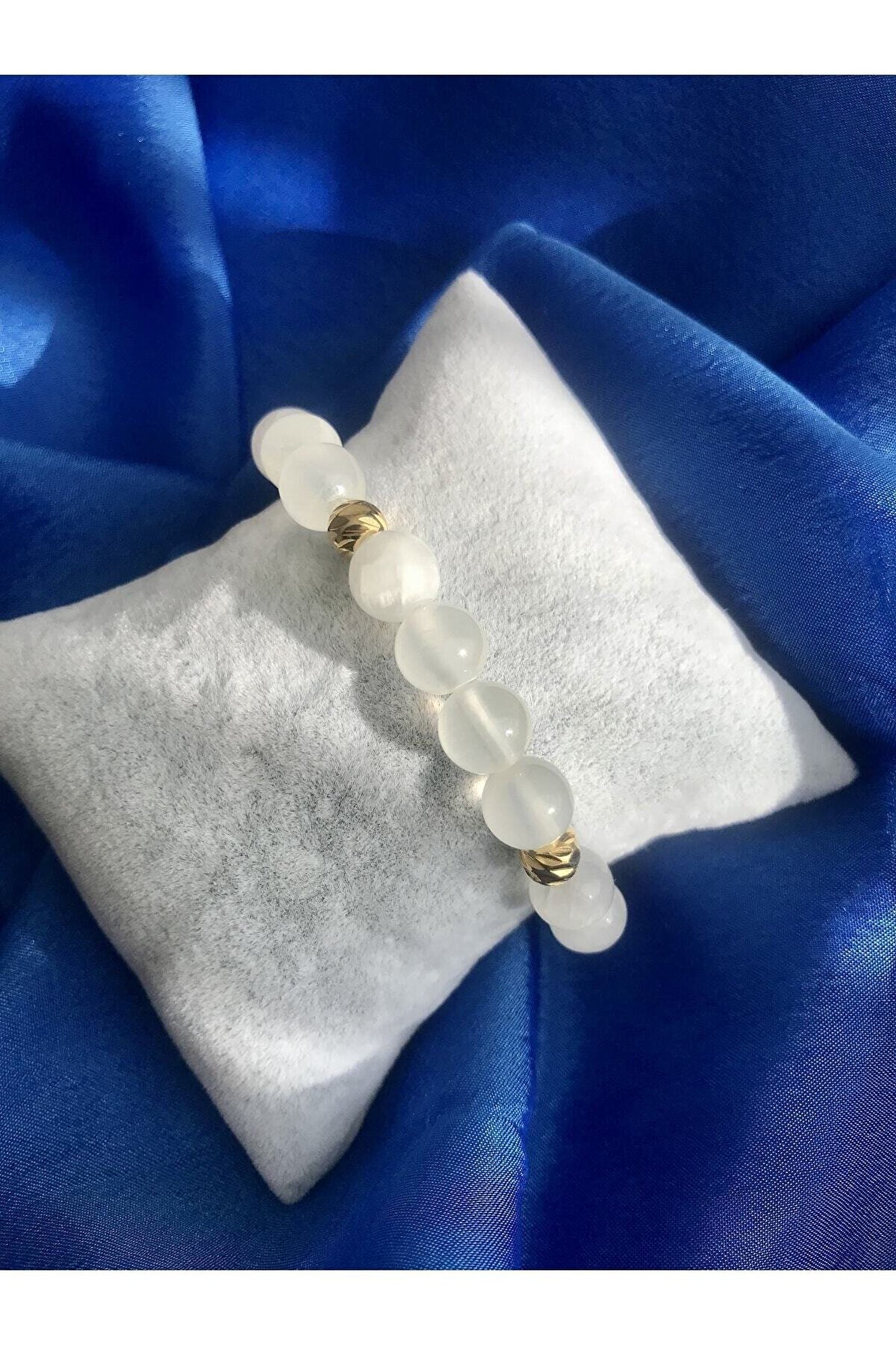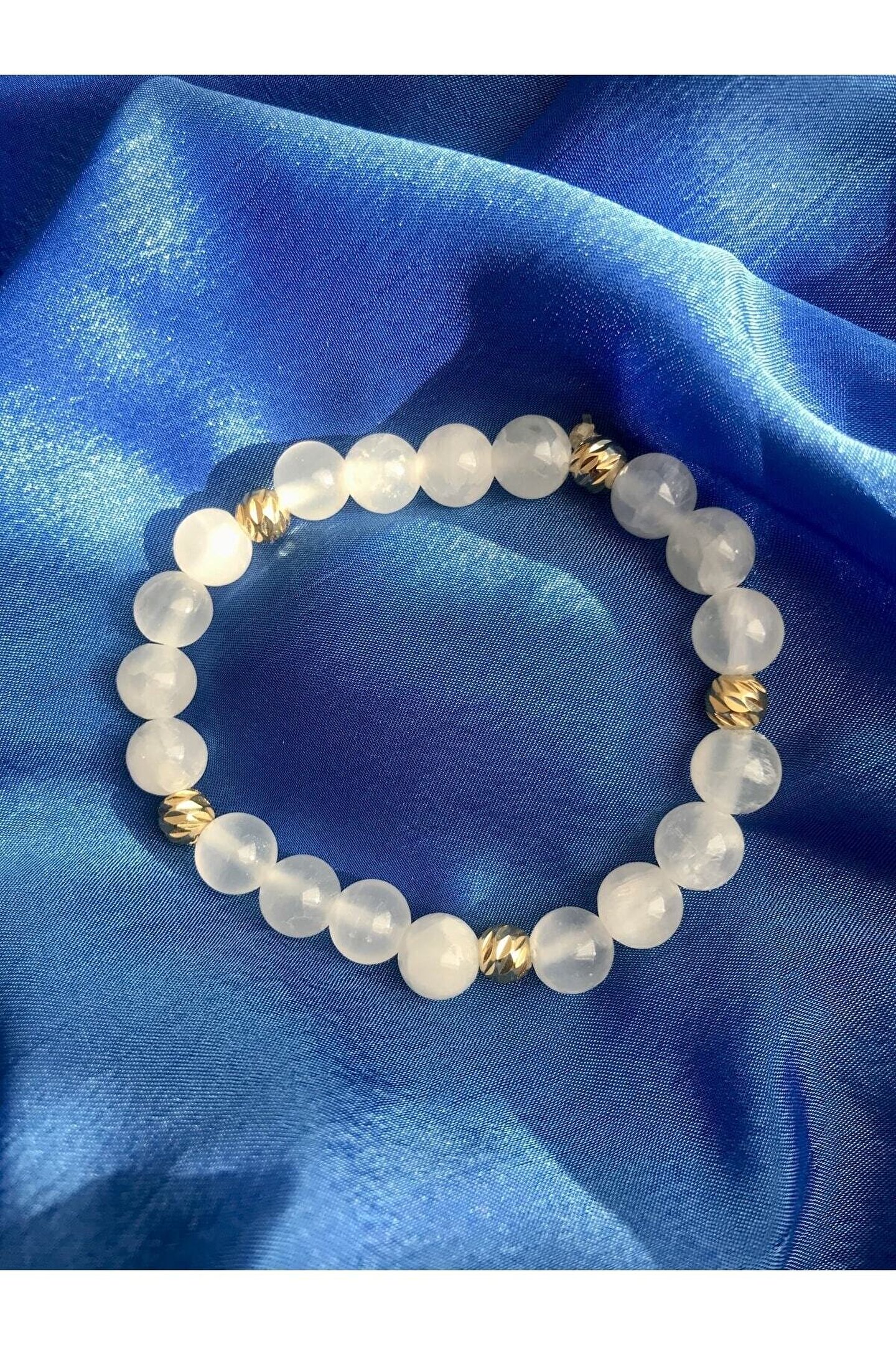 8 mm selenit şık bileklik.lastikli misinededir.altın kaplama toplarla süslenmiştir