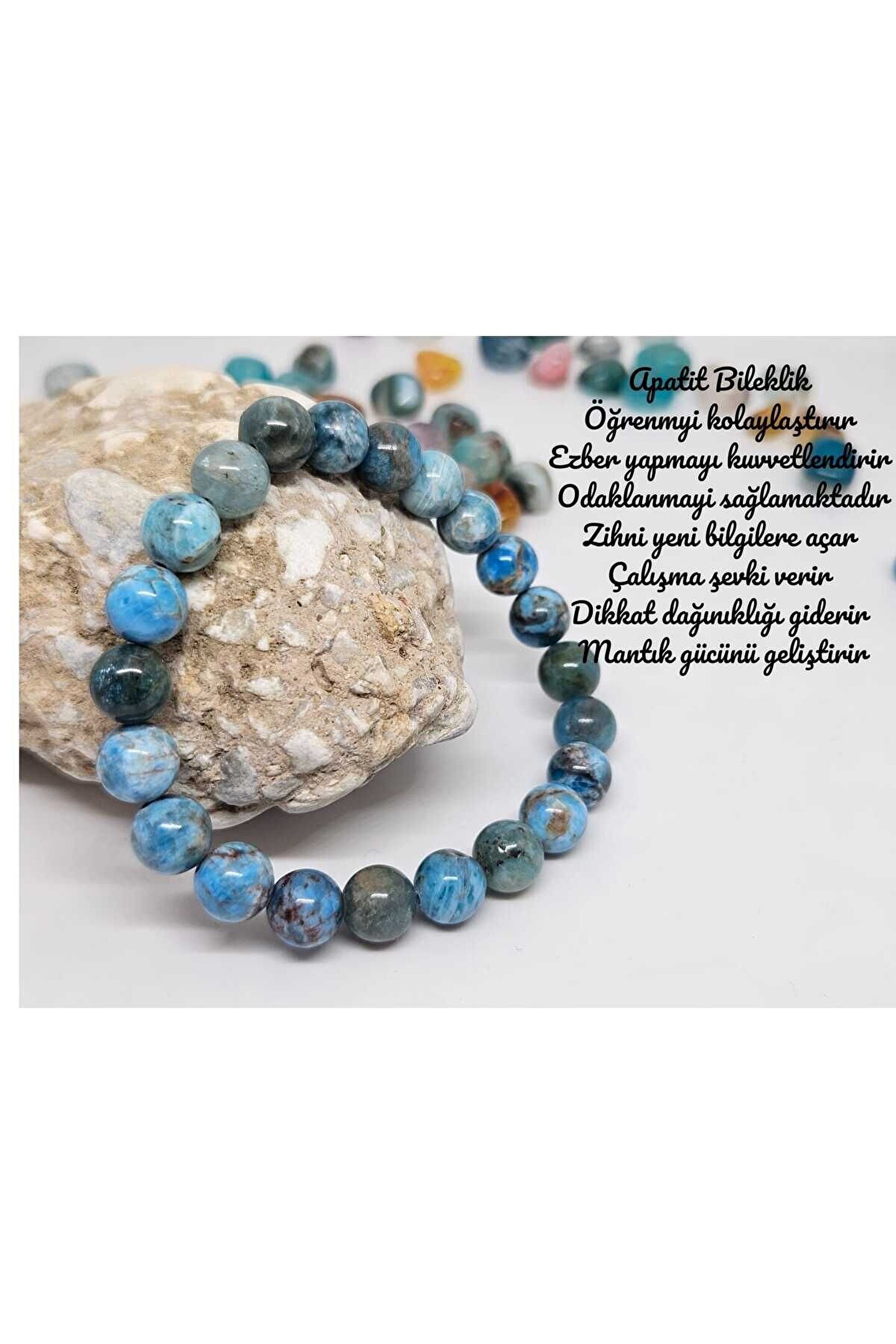 Doğal Apatit taşı kullanılarak tasarlanmış, her bir bileklik benzersiz ve özgün bir görünüm sunar; Gençlerin enerjisine ve stiline hitap eden tasarımıyla dikkat çeker; Taş materyali sayesinde hem şıklığı hem de doğallığı bir arada yaşatır;