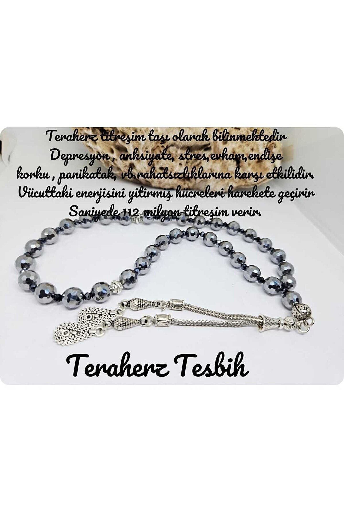 Teraherz taşı titreşim taşı olarak bilinir. ; Saniyede 112 milyon titreşimi vücuda aktarır. ; Vücuttaki enerjisini yitirmiş hücreleri canlandırdığı bilinmektedir. ; Hasarlı dokuların onarılmasına yardımcı olmaktadır. ; Depresyon,anksiyete,stres,evham,endişe,korku,panikatak,vb.rahatsızlıklara iyi geldiği bilinmektedir. ; 8mm faset kesim doğaltaş kullanılmıştır. ; Kullanıcak kişinin ad ve soyad yazabilirseniz kodlama yapılıp gönderilecektir.;
