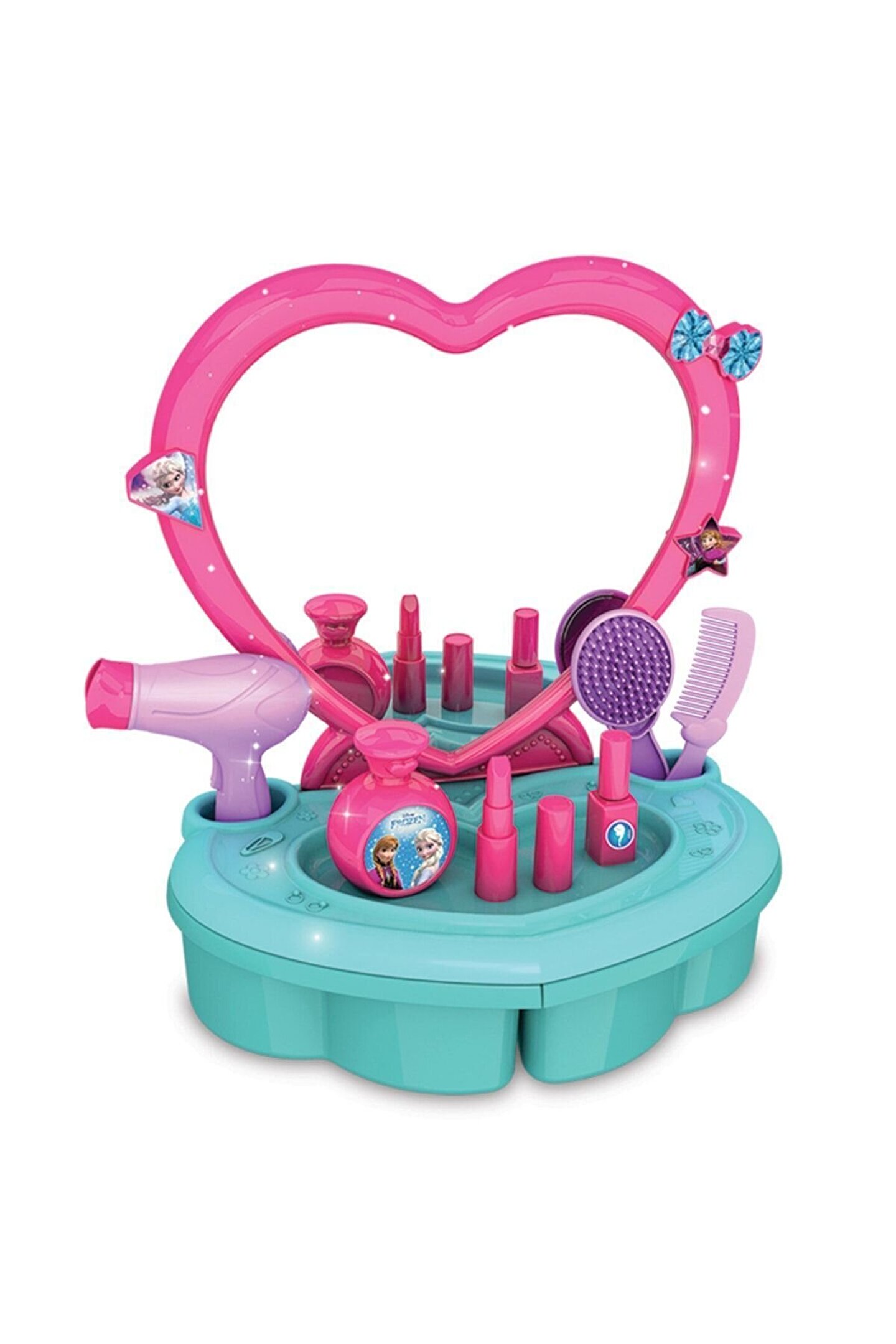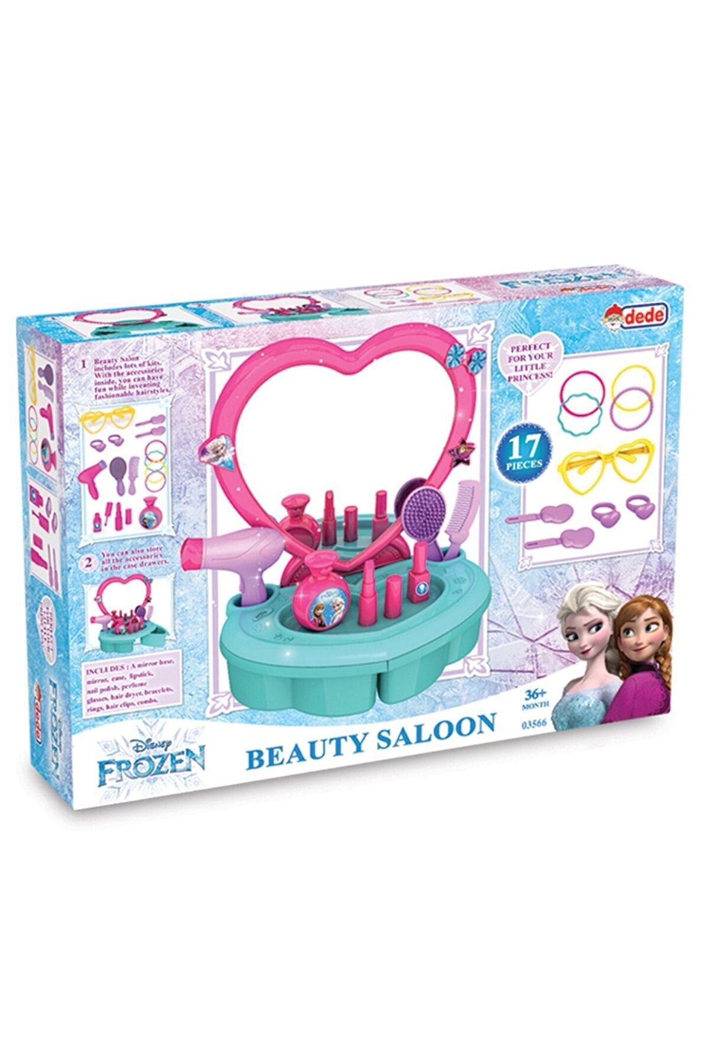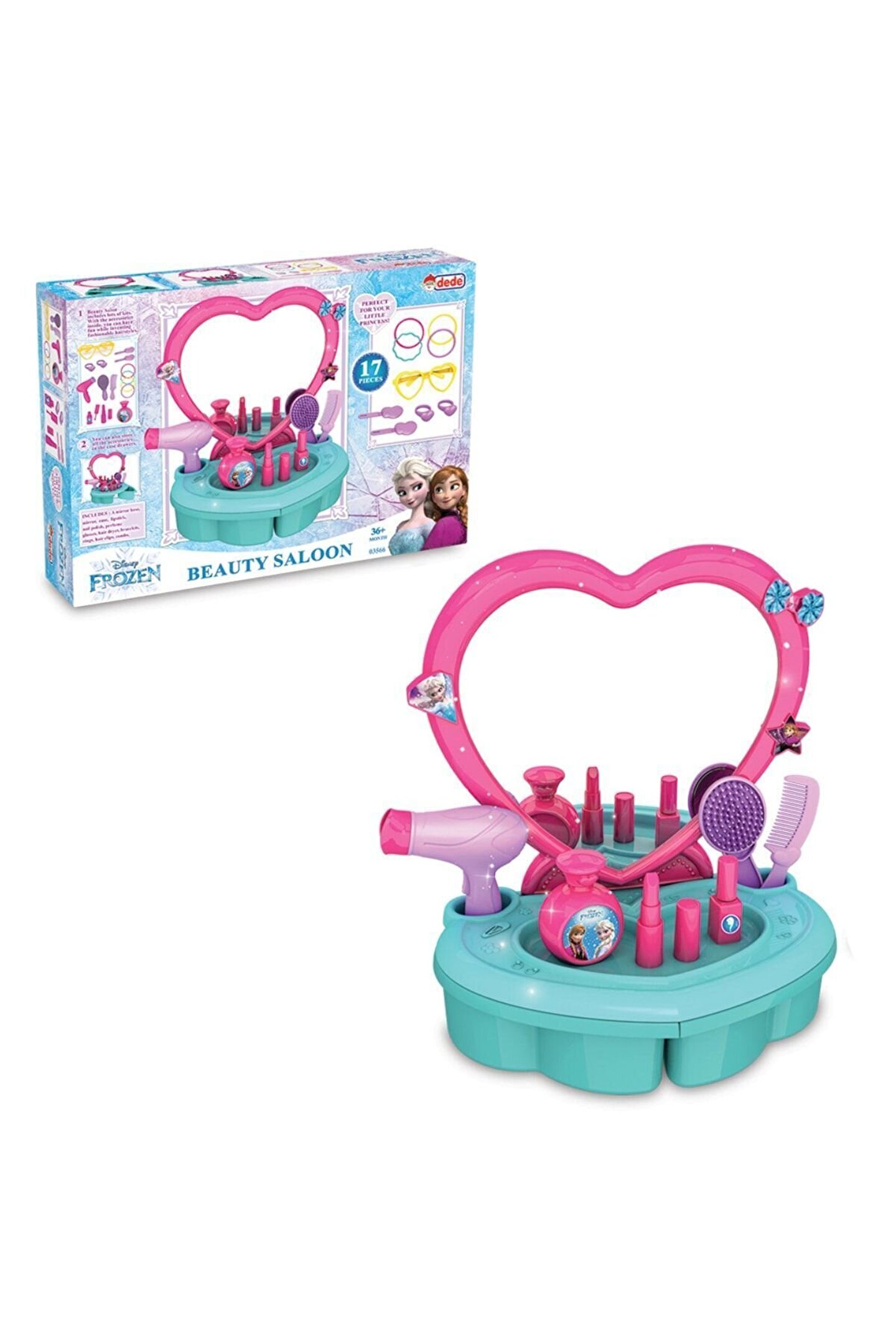 Ürün Bilgileri Cinsiyet: Kız; Marka: Dede; Yaş: 3+; Ölçü: 395 x 85 x 287 mm; Stok Durumu: Stokta Var; Ürün Açıklaması Bu salonda süslenirken çok eğleneceksin! Ürün; 17 parçadan oluşmaktadır. Parçaları setin çekmesinde saklayabilirsin. İçerik; Ayna tabanı, Kendinden yapışkanlı ayna, masa, fotoğraf çerçevesi, saç kurutma makinesi, bilezikler yüzükler, tokalar, tarak ve fırça. Ürün; 3 yaş altı çocuklar için uygun değildir. Sağlık testlerinden geçmiştir.