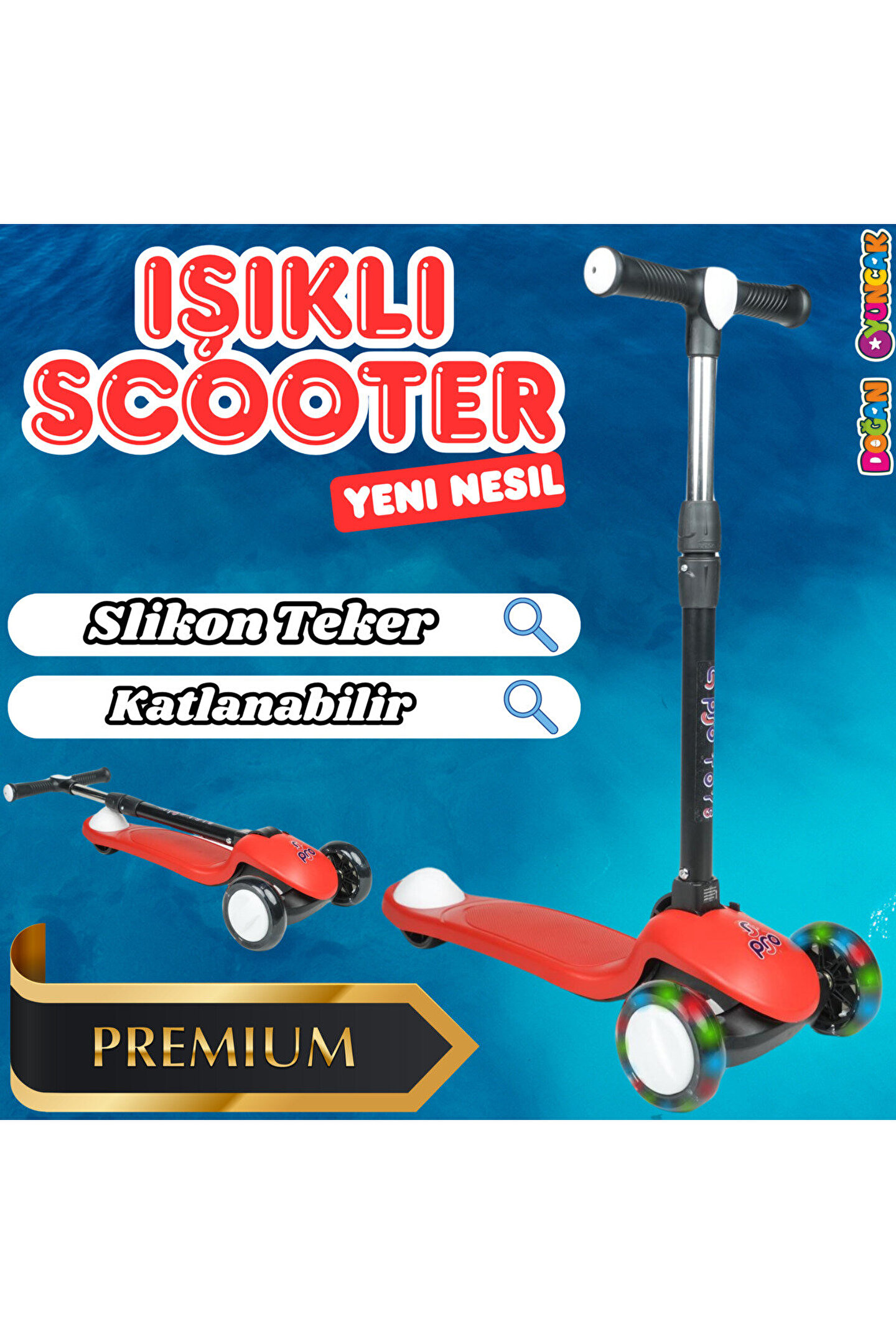 Lupa Katlanabilir Işıklı 3 Tekerlekli Kırmızı Scooter - Işıklı Scooter - Slikon Teker Scooter - Çocu
