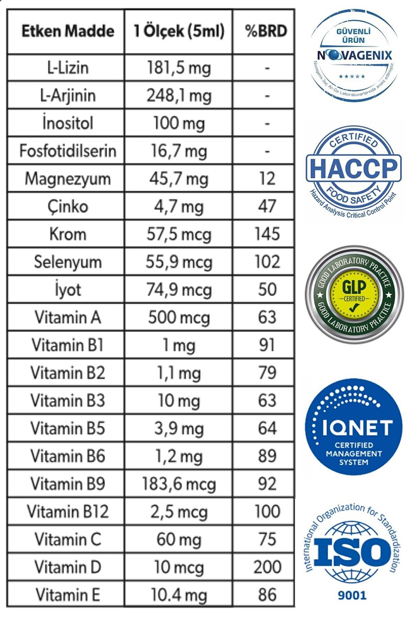 Vitalizin Kids, içeriğinde bulunan Lizin, Arjinin, İnositol, Fosfotidilserin, 5 adet mineral (Magnezyum, Çinko, Krom, Selenyum ve İyot), ve 11 adet vitamin (A, B1, B2, B3, B5, B6, B9,B12, C, D ve E vitaminleri) bulunmaktadır.; 4-10 yaş arası için günde 1 ölçek (5ml), 11 yaş ve üstü için günde 2 ölçek (10ml) tok karnına alınmalıdır.; Gıda takviyesi içerisinde ; jelatin, gluten, maya ve laktoz bulunmamaktadır.; Ürün vejetaryenlerin kullanımına uygundur.