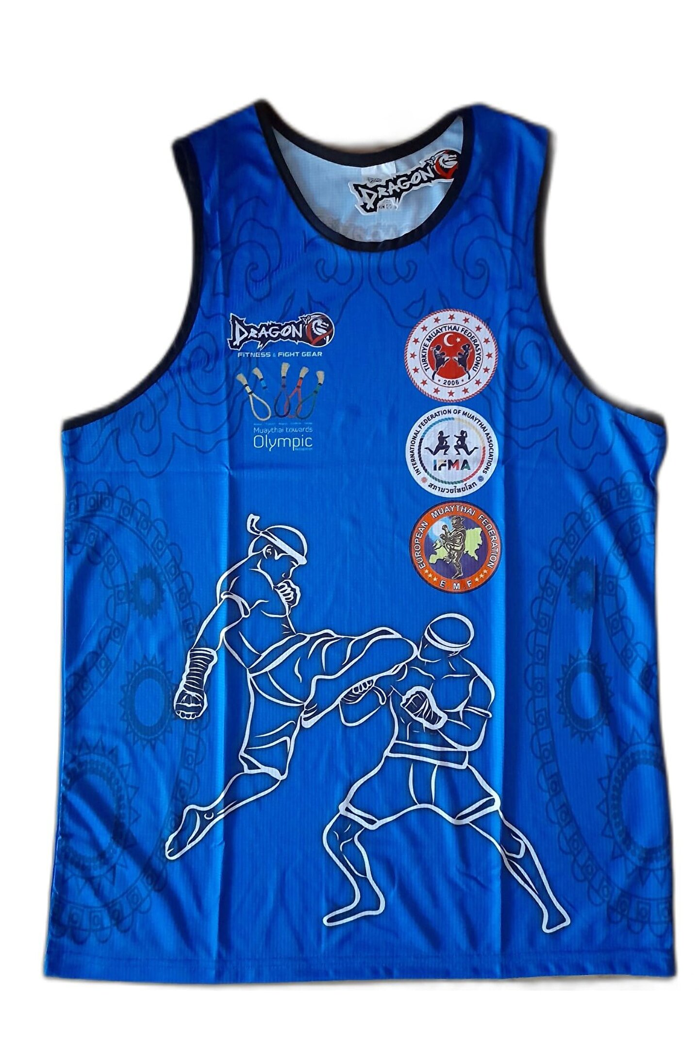 Giftoomsport- Federasyon logolu dijital baskılı muay thaiatlet-Mavi renk ; Muay thai atlet likralı kumaşından imal edilmiştir. ; Atletin ön kısmında muaythai federasyon logosu - Ifma(ınternational fedaration of muay thai ametour) ve emf (european muay thai federation)logoları mevcuttur. ; Arkasında muay thai boks yazısı mevcuttur. ; Muay thai müsabaka atleti, ;