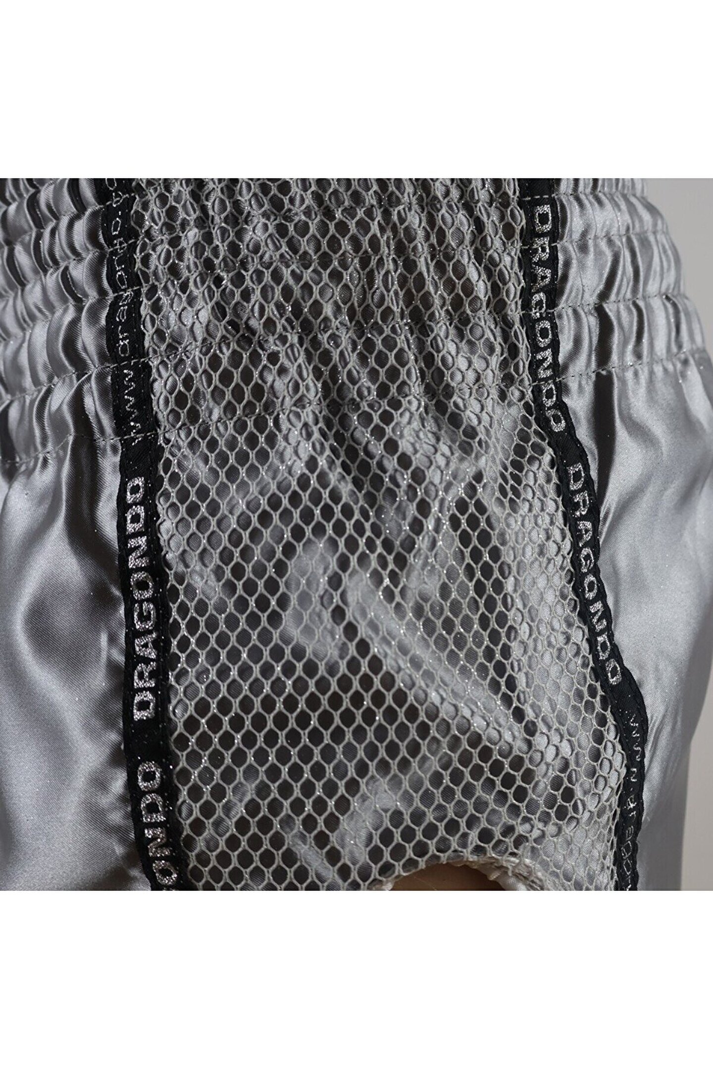 DragonDo MT3076 Shiny Muay Thai Gri Kick Boks Şortu Özel parlak simli kumaştan üretilmiştir.; -Geliştirilmiş kalıbı ve kesimiyle sporculara antrenmanlarda ve maçlarda büyük bir konfor sunar.; -Yan yırtmaçları hareket kolaylığı sağlar.; -Hafiftir ve çabuk kurur.