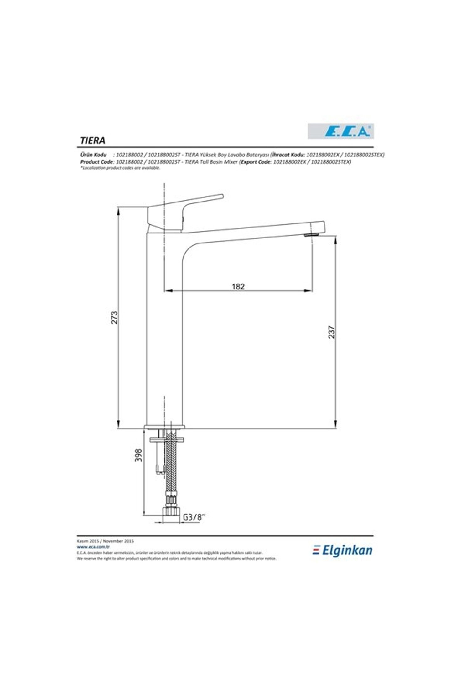 Eca Tiera Yüksek Tip Lavabo Bataryası Çıkış ucu uzunluğu 182 mm'dir; Çıkış ucu yüksekliği 237 mm'dir; Kireç kırıcılı gizli perlatör; 3 bar basınçta su akış miktarı dakikada maksimum 6,9 lt;