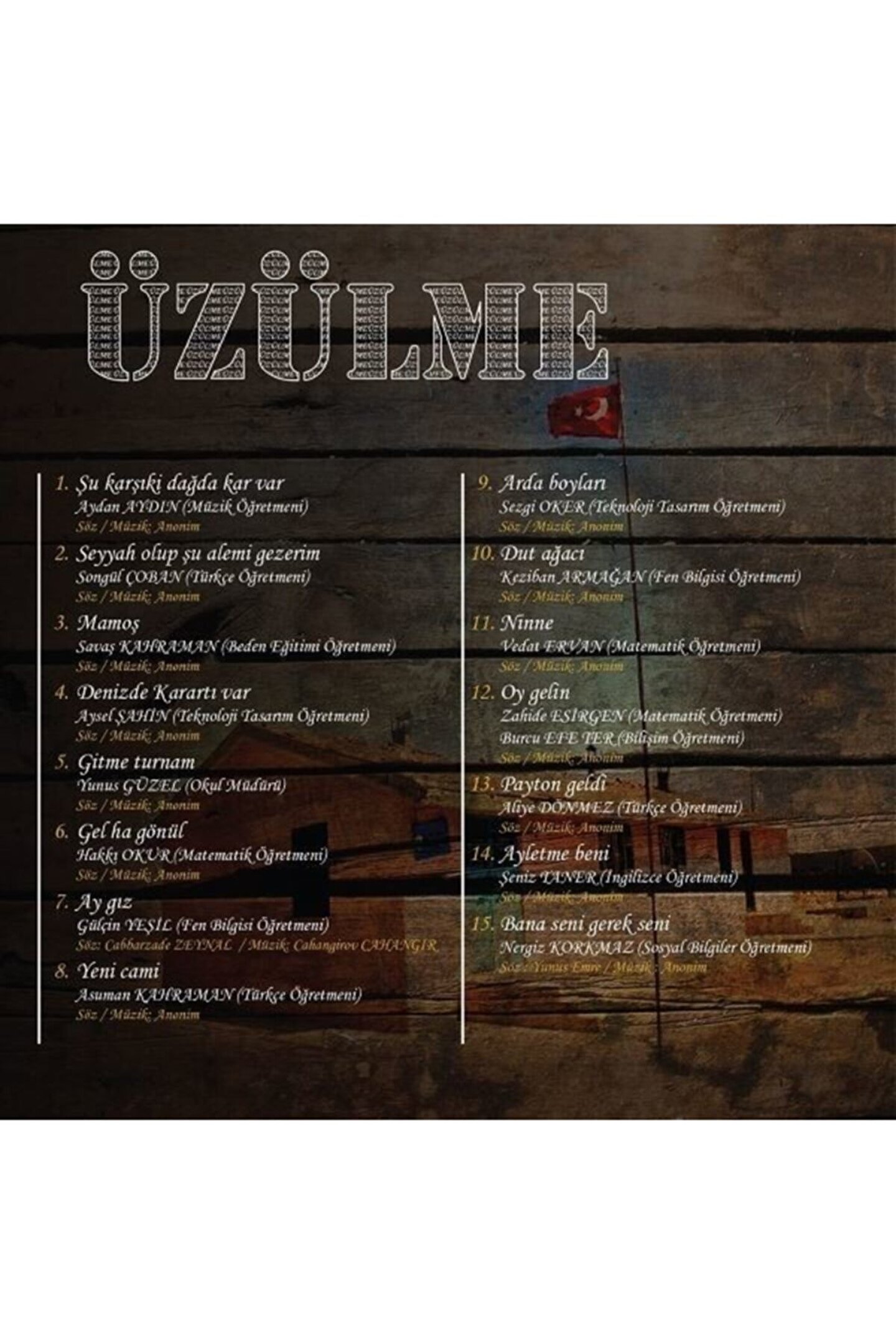 Üzülme ( abdi ibrahim ortaokulu öğretmenleri söylüyor) cd 1; Şu karşıki dağda kar var 2; Seyyah olup şu alemi gezerim 3; Mamoş 4; Denizde karartı var 5; Gitme turnam 6; Gel ha gönlüm 7; Ay gız 8; Yeni cami 9; Arda boyları 10; Dut ağaçı 11; Ninne 12; Oy gelin 13; Payton geldi 14; Eyletme beni 15; Bana seni gerek seni;