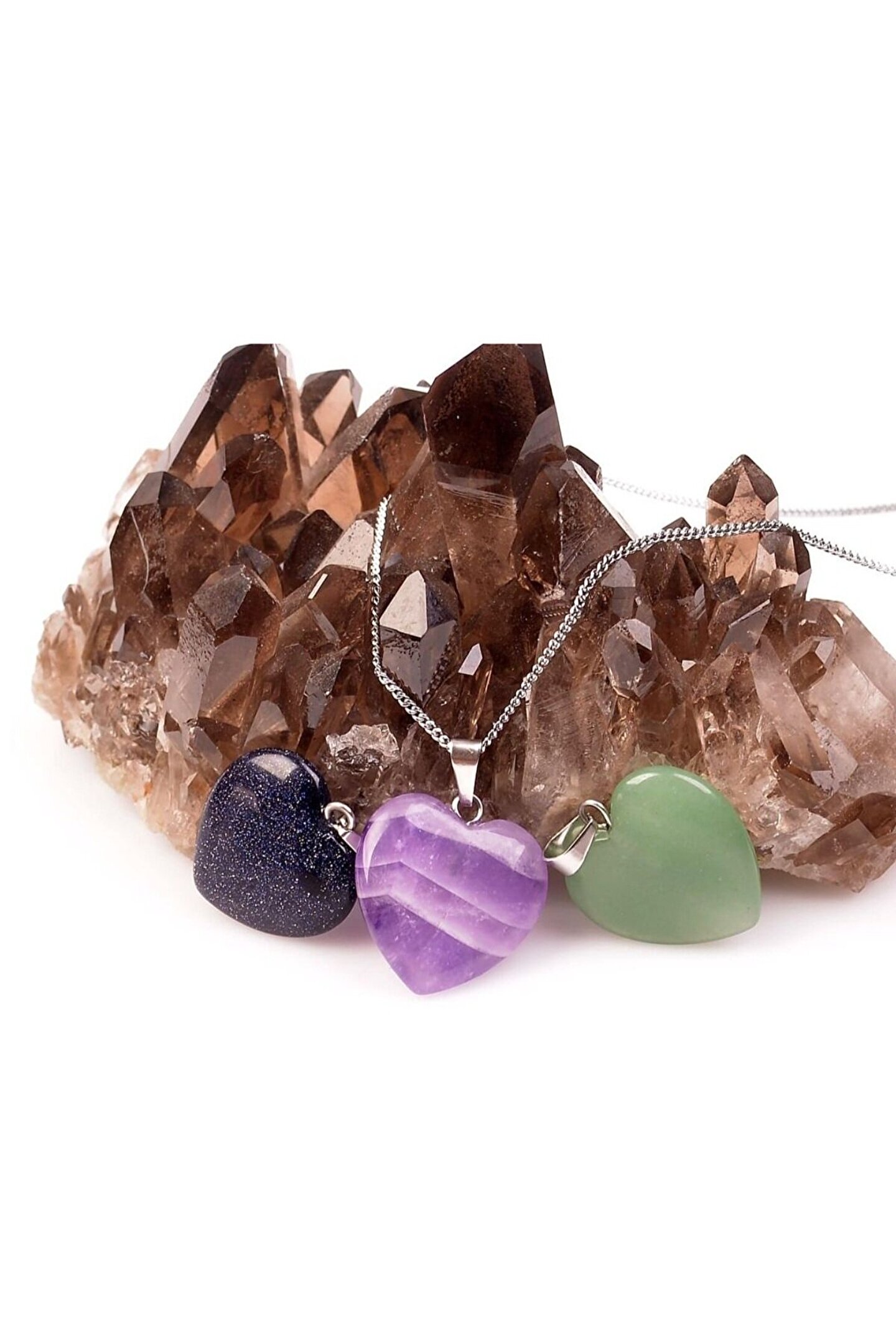 Bu Üründe Kullanılan Doğal Taş:Aventurin Taşı, Ametist Taşı, Yıldız Taşı Bu Üründe Kullanılan Doğal Taş Boyutu: · Ortalama En : 2 cm · Ortalama Boy : 2 cm · Ortalama Kalınlık: 5 mm Ortalama Zincir Uzunluğu: 45 cm Not: Ürünler doğal taş olduğu için renk tonları küçük farklılıklar gösterebilir. ; Zincir modeli stok durumuna göre farklılık gösterebilir. ; Fotoğrafta görünen üç adet kalp şeklinde kolye ucu ve bir adet zincir kargolanacaktır.;