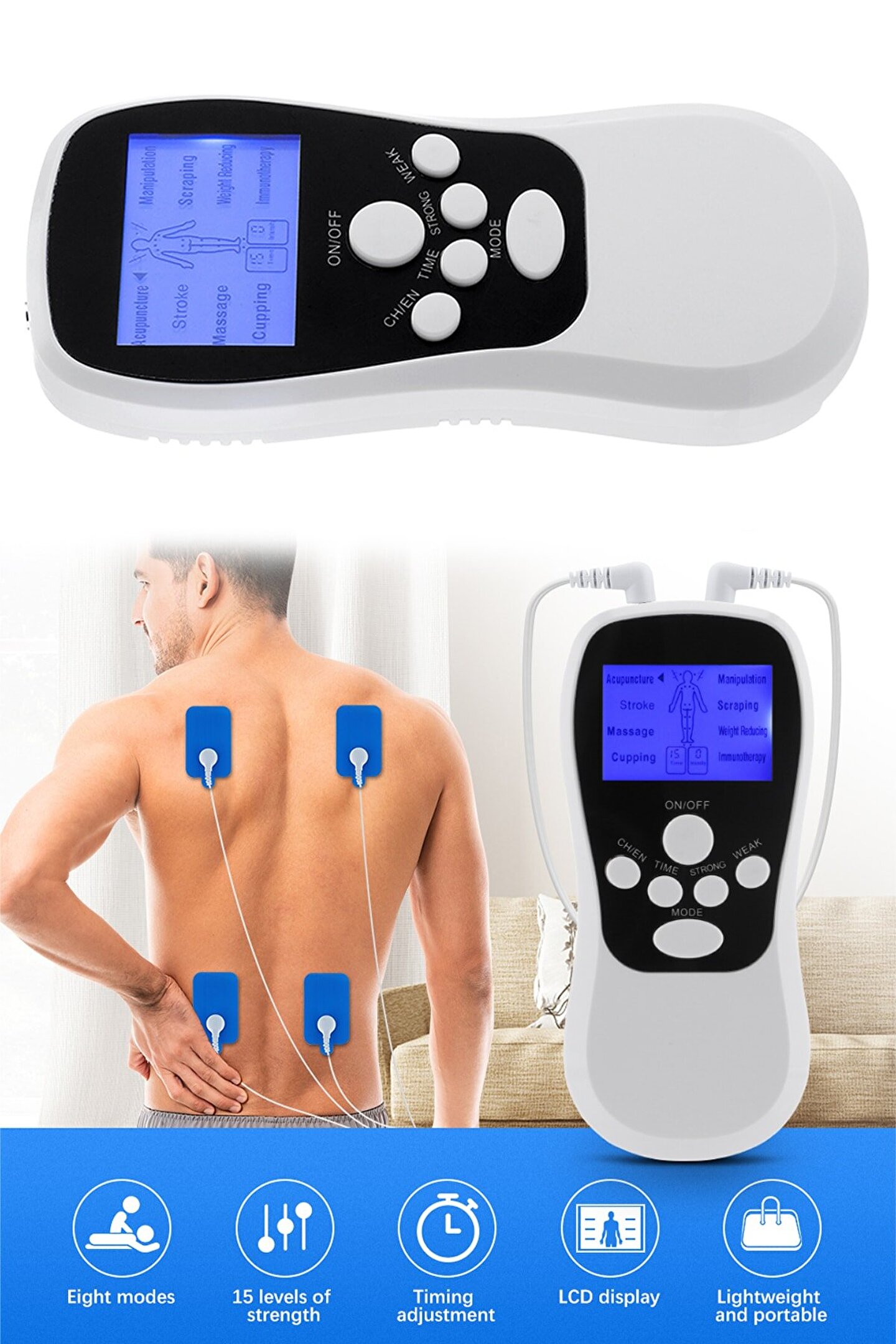 Uluslararası gelişmiş mikro bilgisayar elektronik teknolojisi kullanılarak yüksek teknoloji içeriğine sahip bu tür çok işlevli mikro elektronik masaj aleti olarak üretilmiştir. Geliştirilen bu cihaz düşük devirli simülasyon altında insan vücuduna masaj uygulaması yapmaktadır. Günün yorgunluğunu almanızda ve vücudunuzun rahatlamasında size yardımcı olacaktır. ; Cihaz omuz, bel, diz, eller ve ayaklar için uygundur. ; Kullanımı kolay, kendi kendine uygulaması kolaydır. ; 8 farklı mod özelliği vardır. ; Pil ve USB kablo ile çalıştırılabilme özelliği mevcuttur. ;