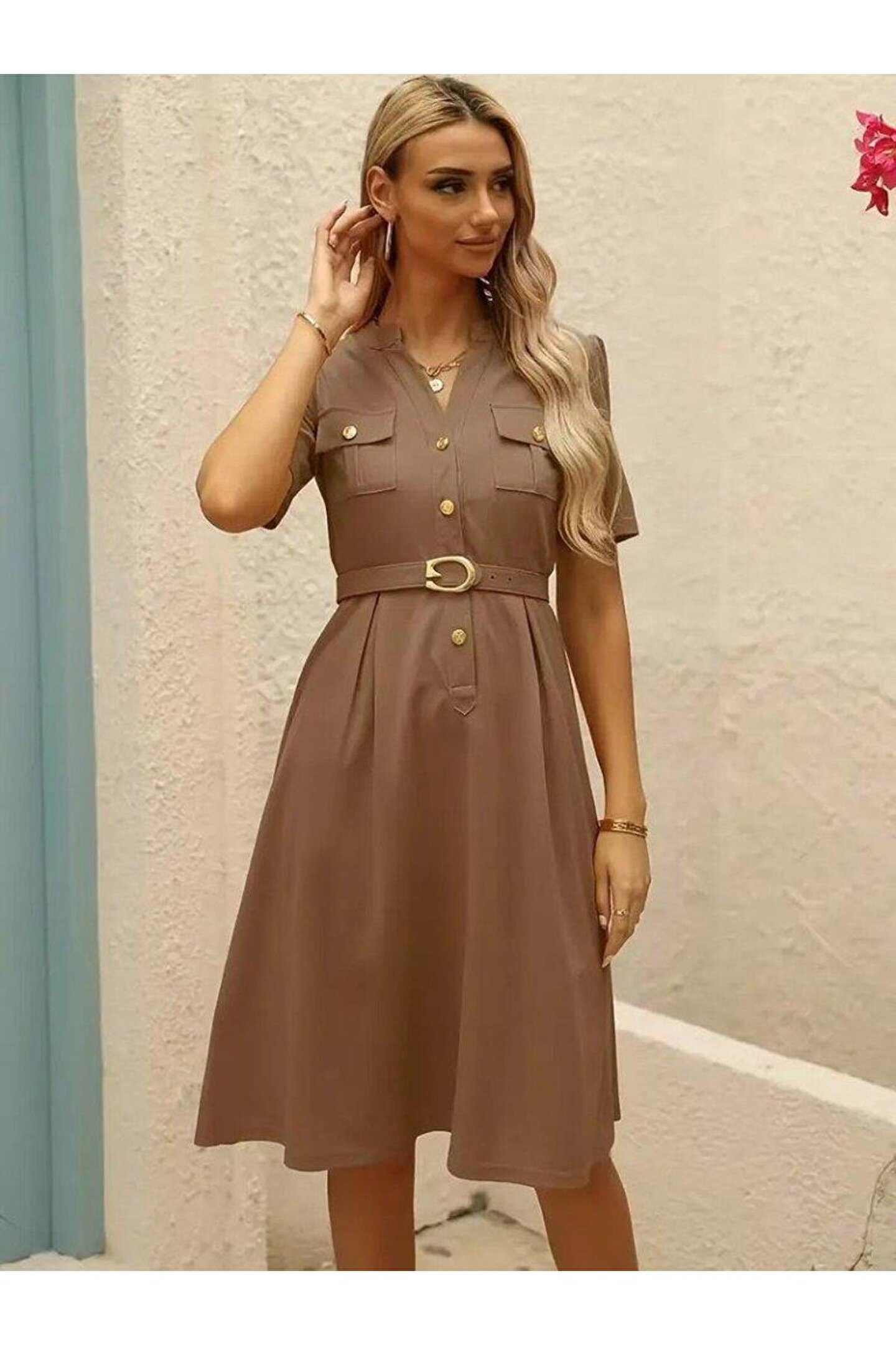 - Yaz aylarının vazgeçilmez parçası olan bu kadın kısa kollu elbise, hafif ve nefes alabilen örme kumaşıyla gün boyu konfor sunar.; - Sürdürülebilir malzemeler kullanılarak üretilmiş olup, çevre dostu bir tercih yapmanızı sağlar.; - Vücudu sararak feminen bir siluet oluştururken, kemer detayı belinizi zarifçe vurgular.; - Pratik çift cepli tasarımı ile günlük eşyalarınızı yanınızda taşımanız için idealdir.; - Klasik koleksiyonun sadeliğini yansıtan düz deseniyle her ortamda şıklığınızı korumanız mümkündür.; - İnce yapısı sayesinde sıcak yaz günlerinde serin kalmanızı desteklerken, dar kesimi modern bir görünüm kazandırır.; - Gömlek yakası ve kısa kol detaylarıyla hem rahatlık hem de stil sahibi bir duruş sergiler.; - Astarsız oluşu hafifliği arttırarak hareket özgürlüğü tanırken, klasik tarza uygunluğuyla zamansız bir parça haline gelir.