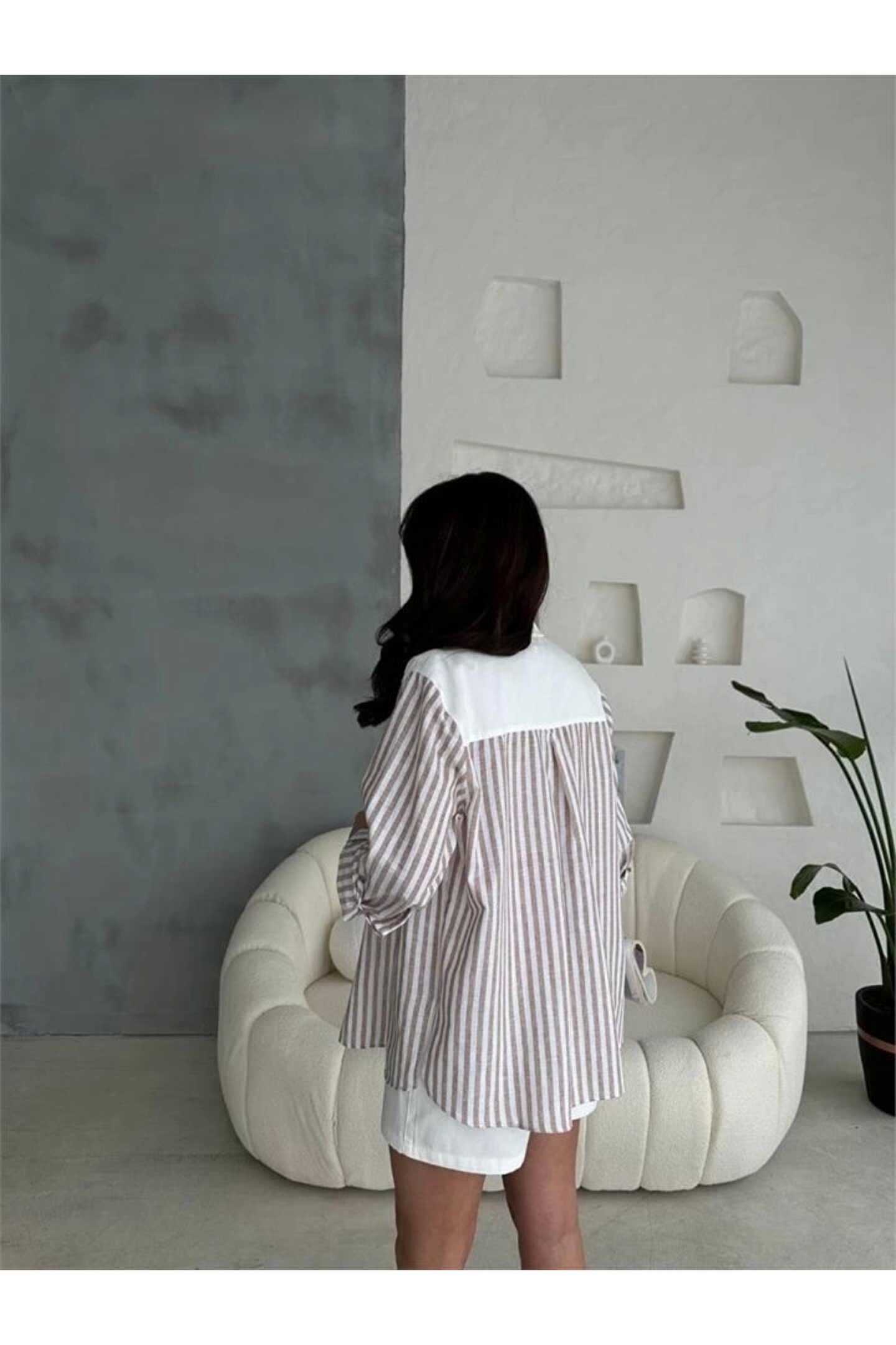 EDAYHomeButik GABARDİN ŞORT GABARDİN ÇİZGİİ KETEN GARNİİ CEKET TAKI Kahverengi