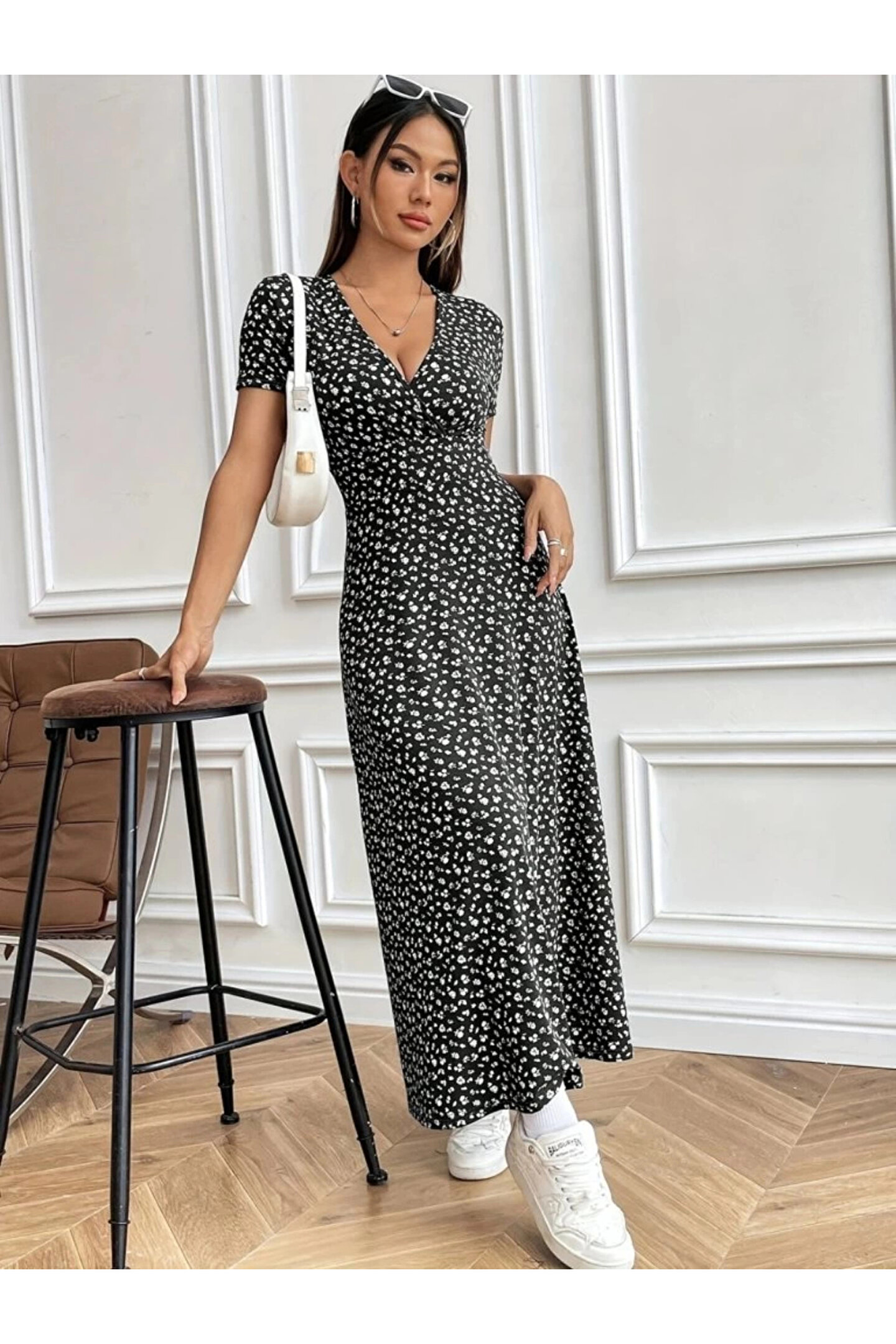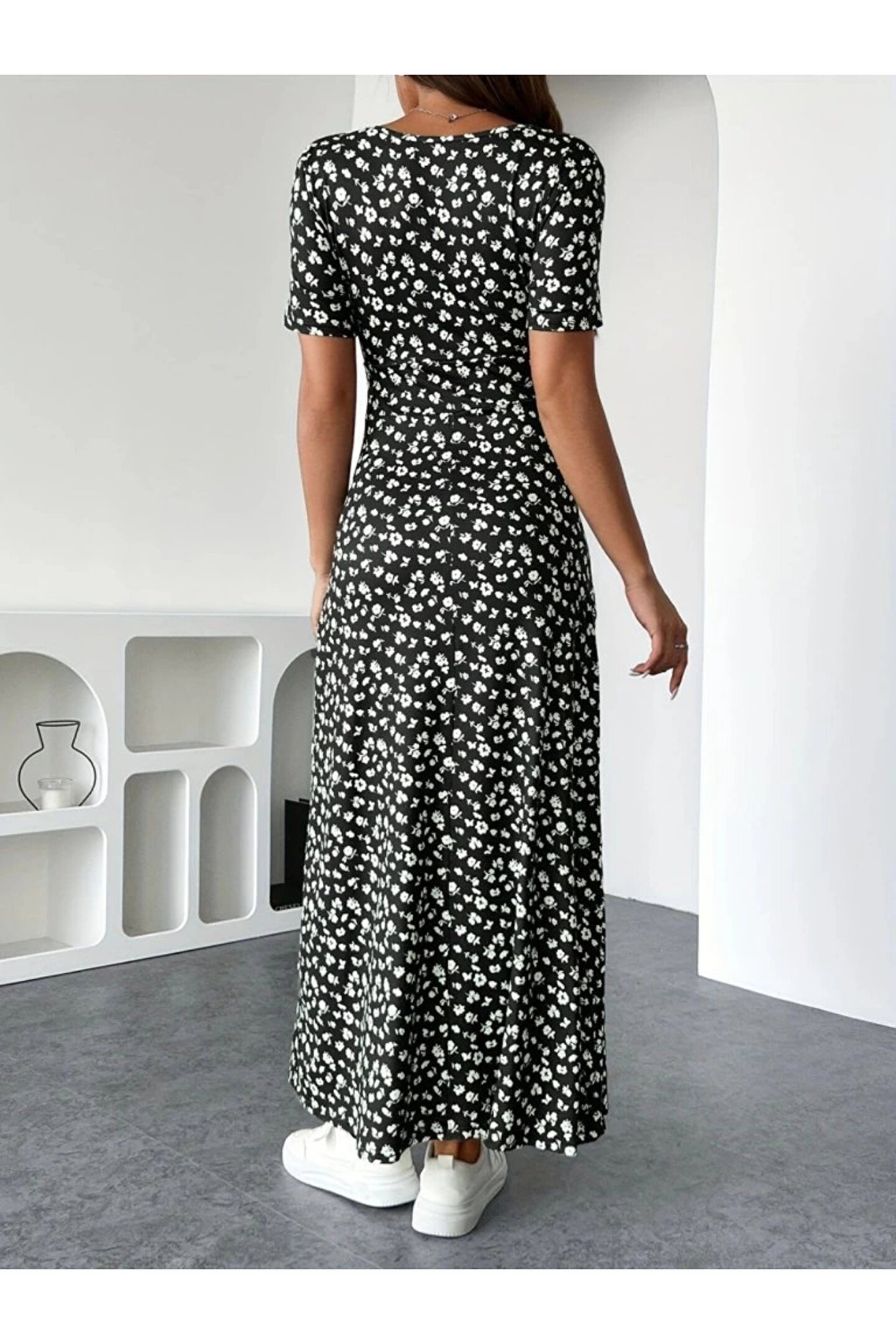 Kadın Kısa Kollu Kruvaze Yakalı çiçek Desenli Süprem Elbise