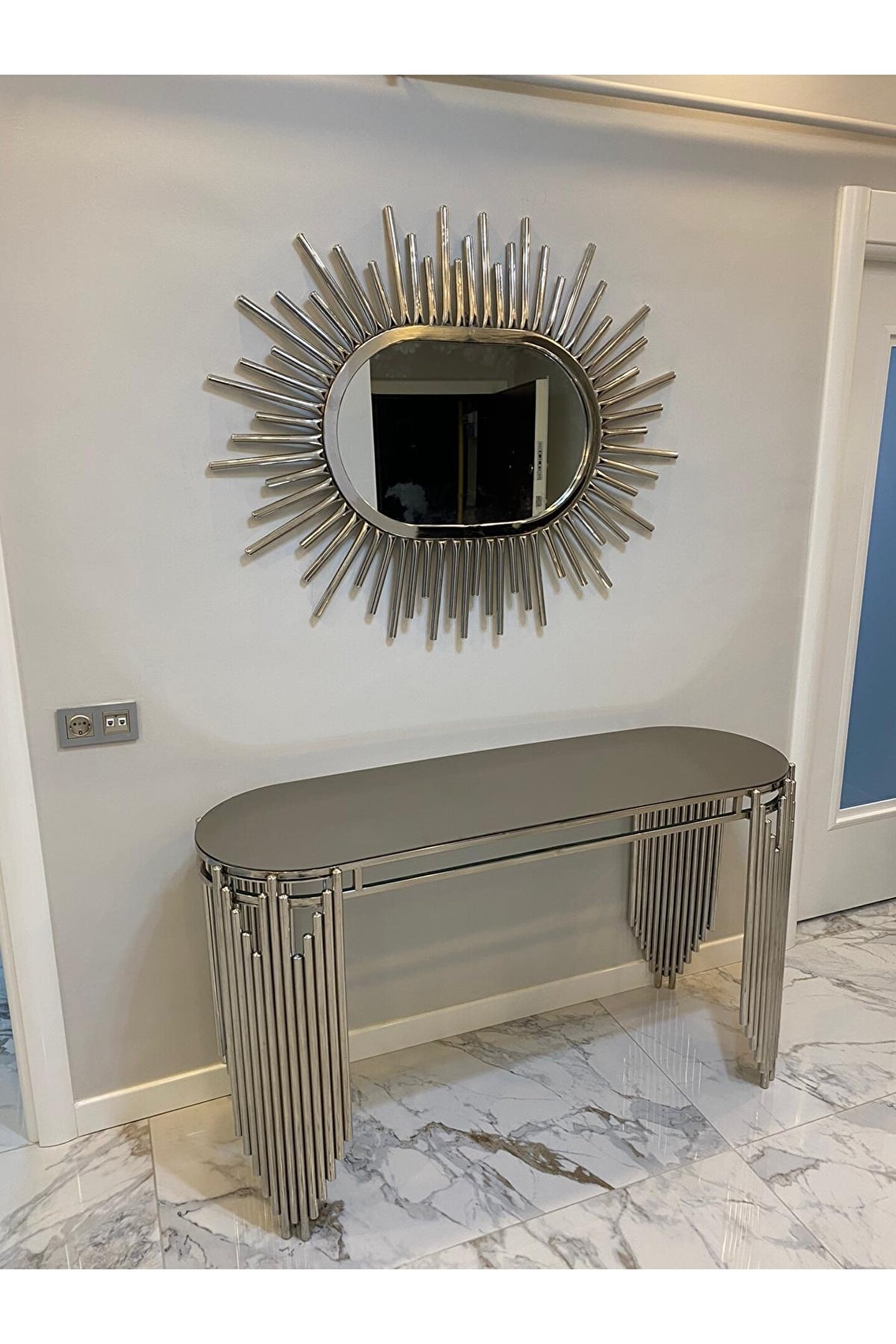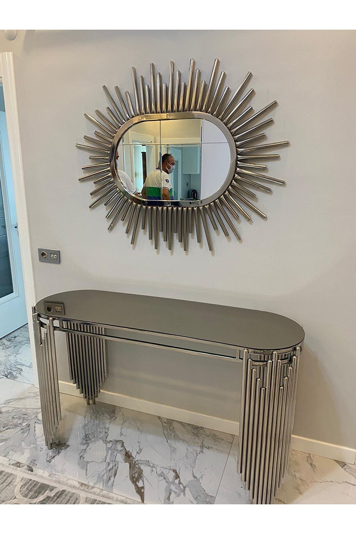 - Modern tasarımıyla dikkat çeken bu dresuar, metal malzemesi sayesinde uzun ömürlü ve dayanıklı bir kullanım sunar; - Elips aynası, mekanınıza modern bir dokunuş katarken, günlük kullanım için pratik bir ayna alternatifi sunar; - Şık gümüş rengi ile her türlü dekorasyona kolayca uyum sağlar ve mekanınıza lüks bir hava katar;