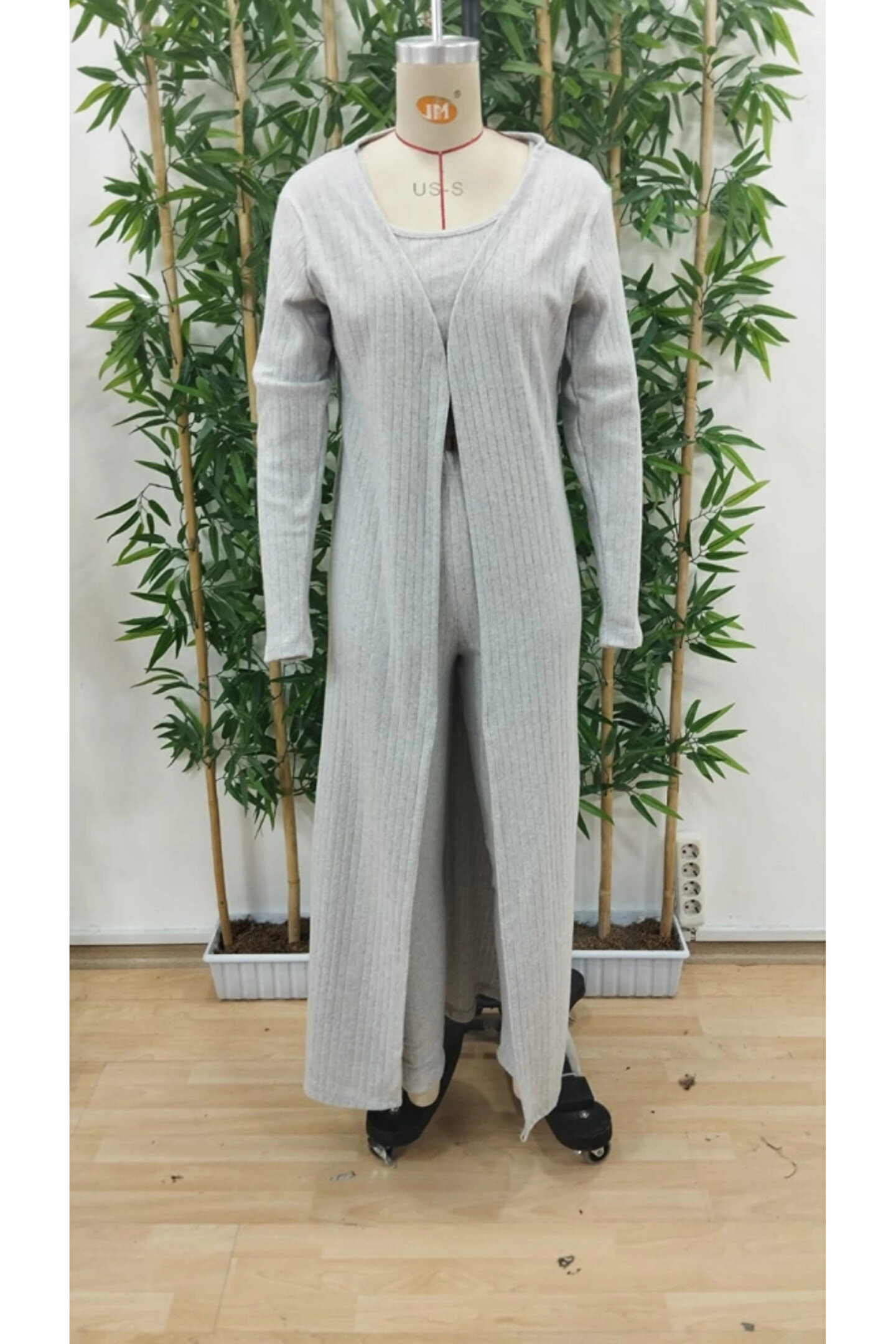 Kadın Yuvarlak Yaka Askılı Krop Bluz Yüksek Bel Tayt Ve Uzun Hırka şardonlu Kaşkorse üçlü Takım