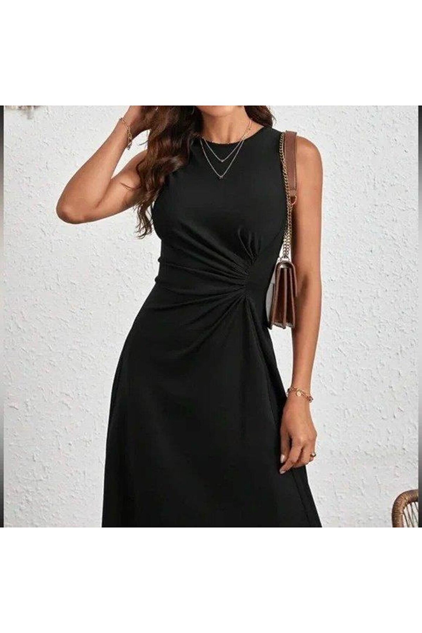 Kadın Sıfır Kollu Bisiklet Yaka Büzgülü Asimetrik Kesim Detaylı Janjan Krep Elbise