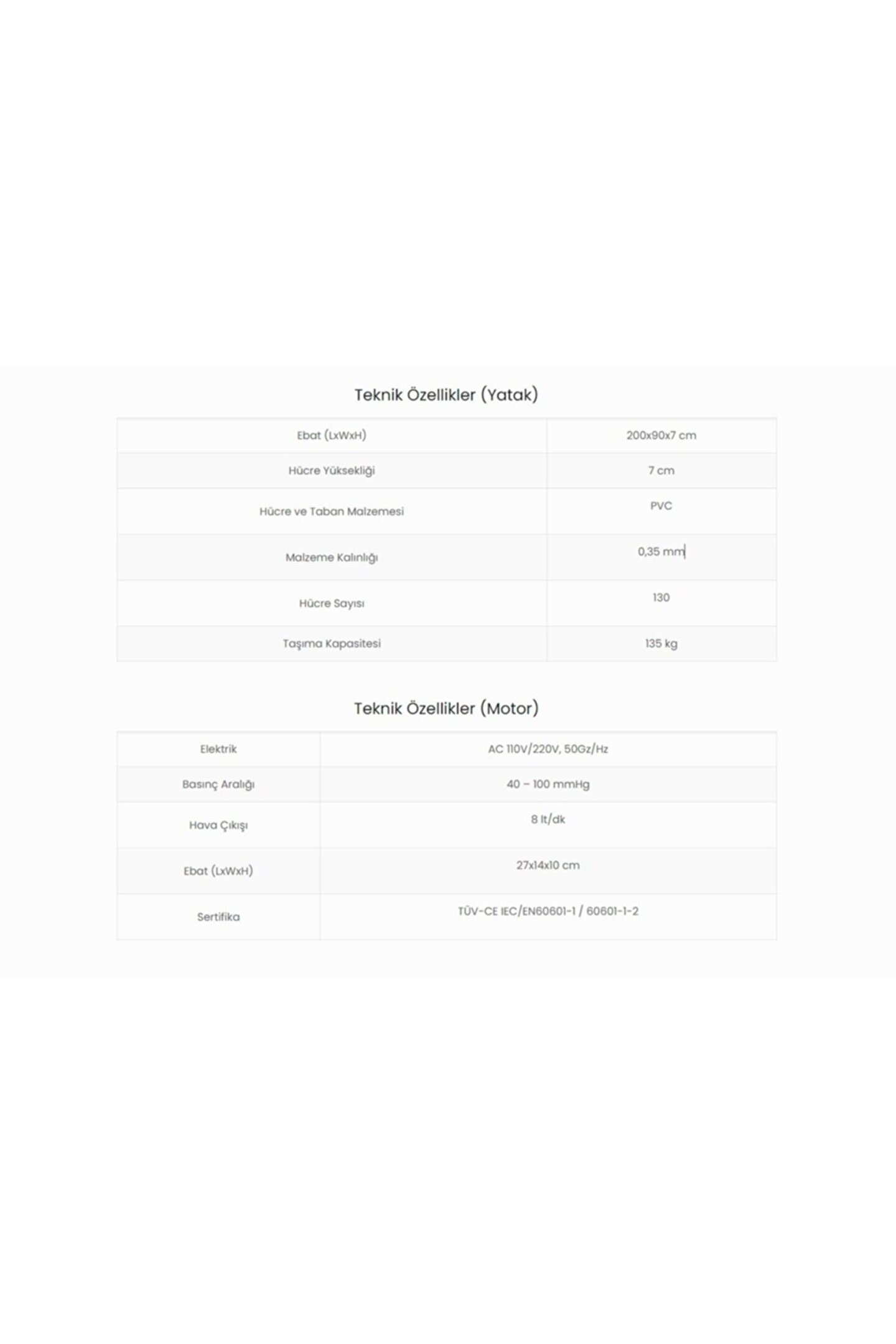 Elmaslar lifetime qdc; 303 havalı yatak ürün özellikler; maksimum kullanıcı ağırlığı=135kg; yatak boyutları=200x90x7cm; kanat uzunluğu(baş ve ayak kısmındaki ekstra uzunluk)=50+50cm; malzeme =tıbbi sınıf pvc; devir süresi=6 dk; hava çıkışı=6; 7l/dk; basınç aralığı=40; 100 mmhg; garanti süresi=2 yıl; yatak yarası oluşumunu engeller; sürekli prize takılı şekilde çalışır;;