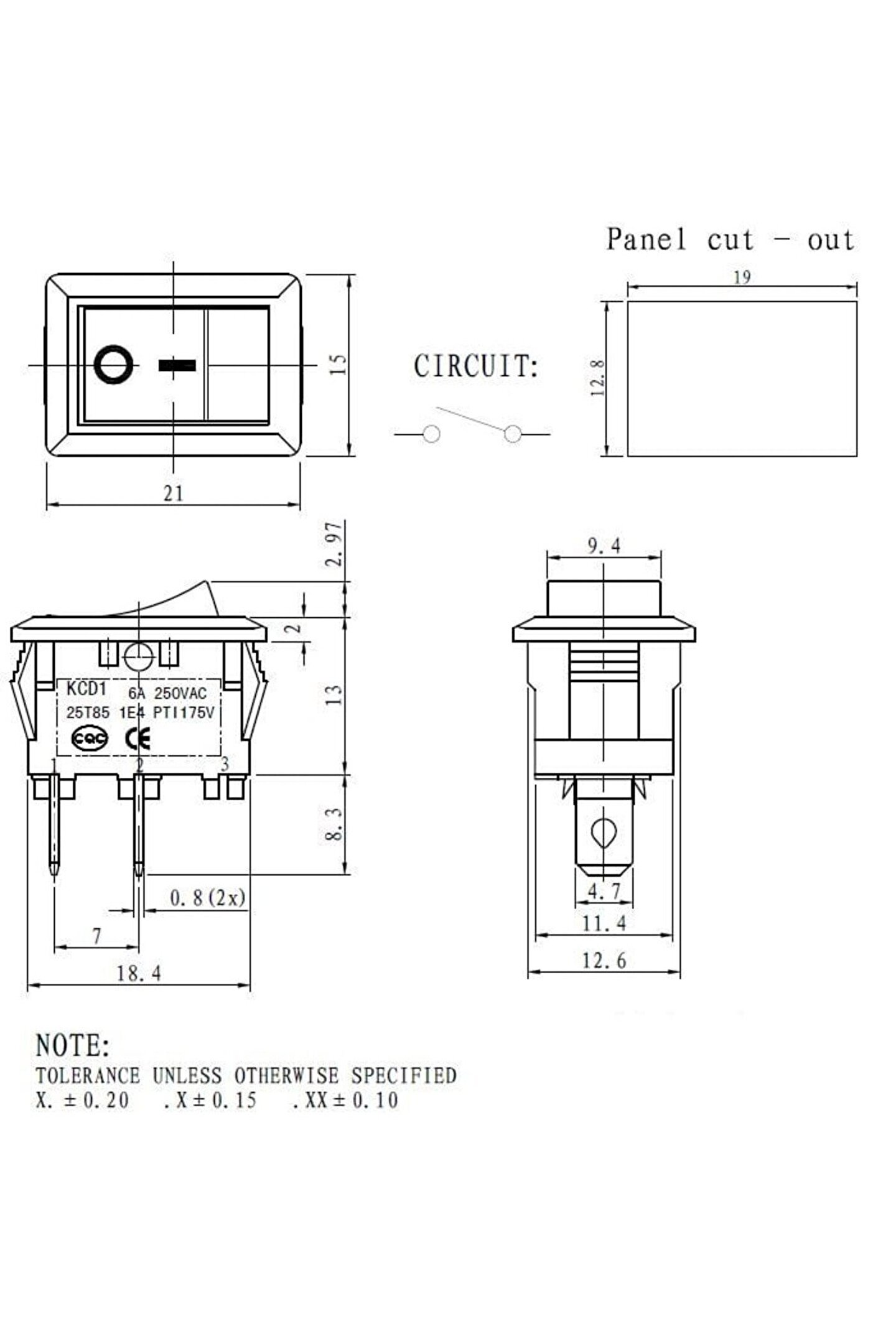 Anahtar, 20 mm çapında ve 6 mm pim aralığına sahiptir. 6 A / 250 V AC veya 10 A / 125 V AC'ye kadar akım ve voltaj için derecelendirilmiştir.