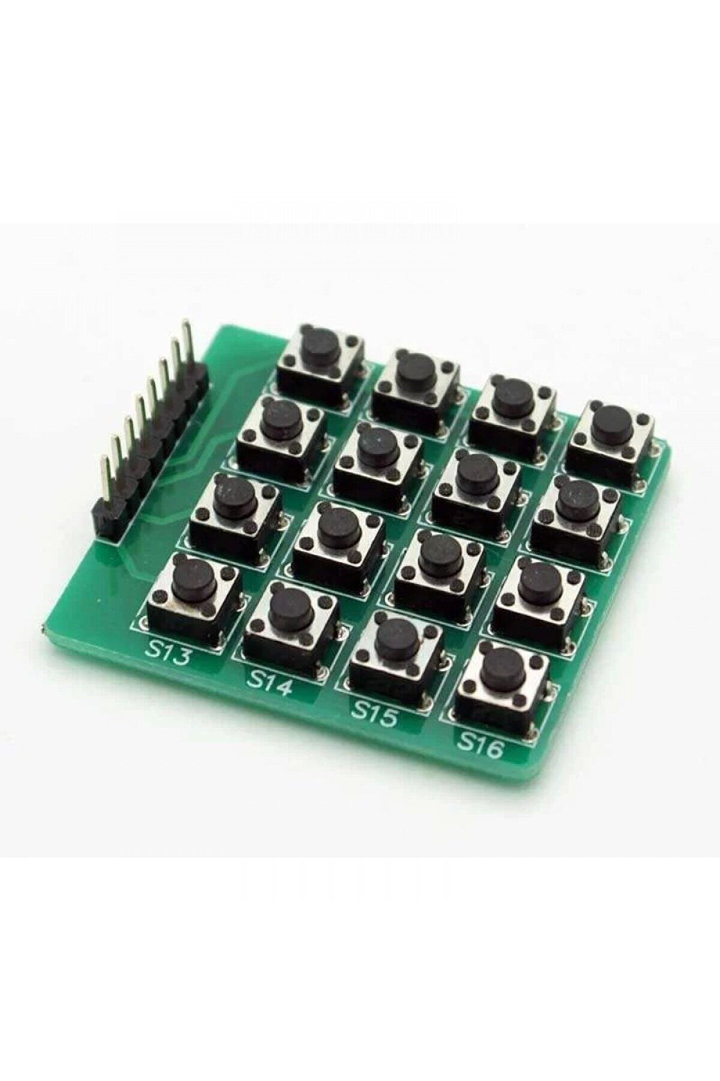 Ürün Adı: Arduino Keypad 4x4 Matrix 16 Button Switch Tuş Takımı Ürün Açıklaması: Arduino Keypad 4x4 Matrix 16 Button Switch Tuş Takımı, Arduino ve diğer mikrodenetleyiciler ile birlikte kullanılan, kullanıcı girişi için tasarlanmış bir modüldür. 16 adet butondan oluşan 4x4 matris dizilimindedir. Ürün Özellikleri: 4x4 matris konfigürasyonu: Bu düzenleme, 16 adet butonun kompakt bir alanda yerleştirilmesine olanak tanır, bu da alan sınırlı olduğunda idealdir.; Dokunsal tuşlar: Tuşlar basıldığında tatmin edici bir tıklama sesi çıkarır, bu da kullanıcı dostu ve duyarlı hale getirir.; Pull-up dirençler: Her bir düğme sırası ve sütunu yerleşik bir pull-up dirençine sahiptir, bu da elektriksel gürültü nedeniyle yanlış düğme basmalarını önlemeye yardımcı olur.; Kolay bağlantı: Düğme takımı, Arduino kartı veya diğer mikrodenetleyicilere jumper kablolar kullanılarak kolayca bağlanabilen erkek başlık pinleri ile birlikte gelir.; Yazılım kitaplıkları mevcuttur: Arduino için hazır bulunan yazılım kitaplıkları, düğme takımını okumayı ve düğme basmalarını yorumlamayı basitleştirir.; Ürün Uygulamaları: Etkileşimli projeler için kullanıcı girişi: Projenizin çeşitli yönlerini kontrol etmek için düğmeyi kullanabilirsiniz, örneğin sesler çalmak, LED renklerini değiştirmek veya farklı eylemleri tetiklemek.; Veri girişi: Düğmeyi, projenize sayılar, harfler veya başka veriler girmek için kullanabilirsiniz.; Oyun kontrolörleri: Düğmeyi, oyun kontrolörleri oluşturmak için düğmeler ve diğer girdiler için kullanabilirsiniz.; Menü gezintisi: Düğmeyi, projenizdeki menülerde ve seçimlerde gezinmek için kullanabilirsiniz.; Ürün Avantajları: Kompakt ve kullanışlı boyut; Dokunsal tuşlar; Pull-up dirençler; Kolay bağlantı; Mevcut yazılım kitaplıkları; Sonuç: Arduino Keypad 4x4 Matrix 16 Button Switch Tuş Takımı, Arduino projenize çeşitli kullanıcı giriş seçenekleri ekleyebilen çok yönlü ve kullanımı kolay bir modüldür.