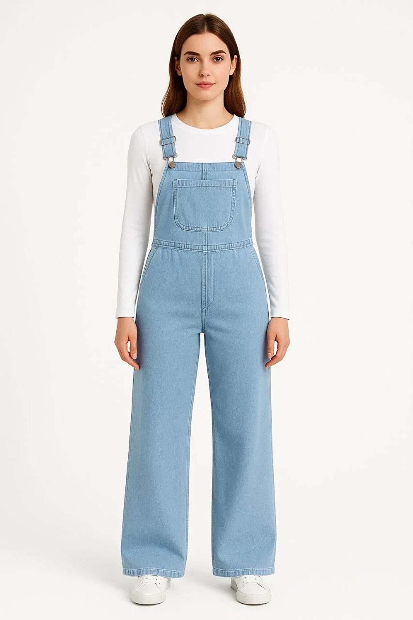 Emu Wear Velmora Premium Kadın Chambray Açık Mavi Denim Görünümlü Geniş Paça Salopet Tulum - Mavi