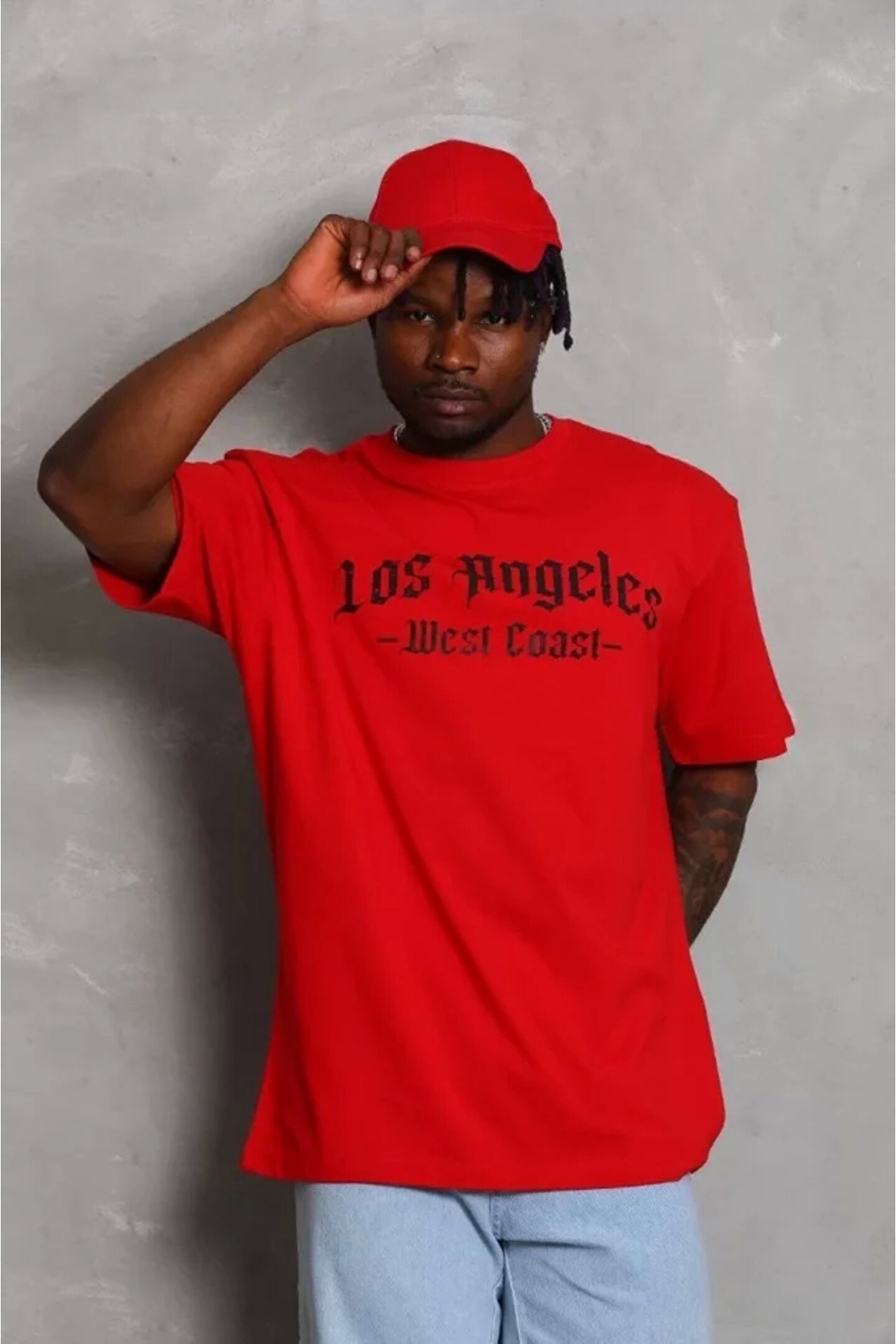 Eosds Unisex Oversize Baskılı Bisiklet Yaka T-Shirt - Kırmızı