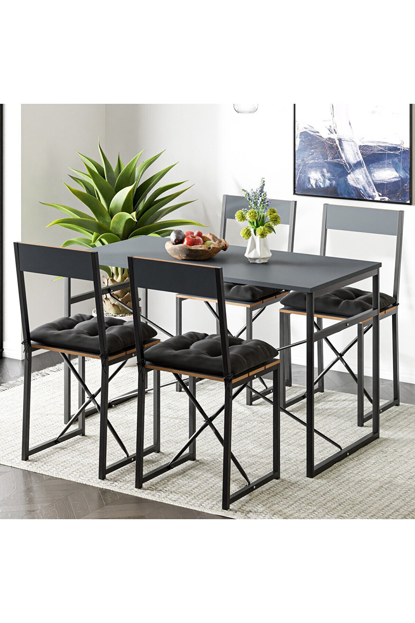Set, dört minderli sandalye ve bir adet masadan meydana gelir.
