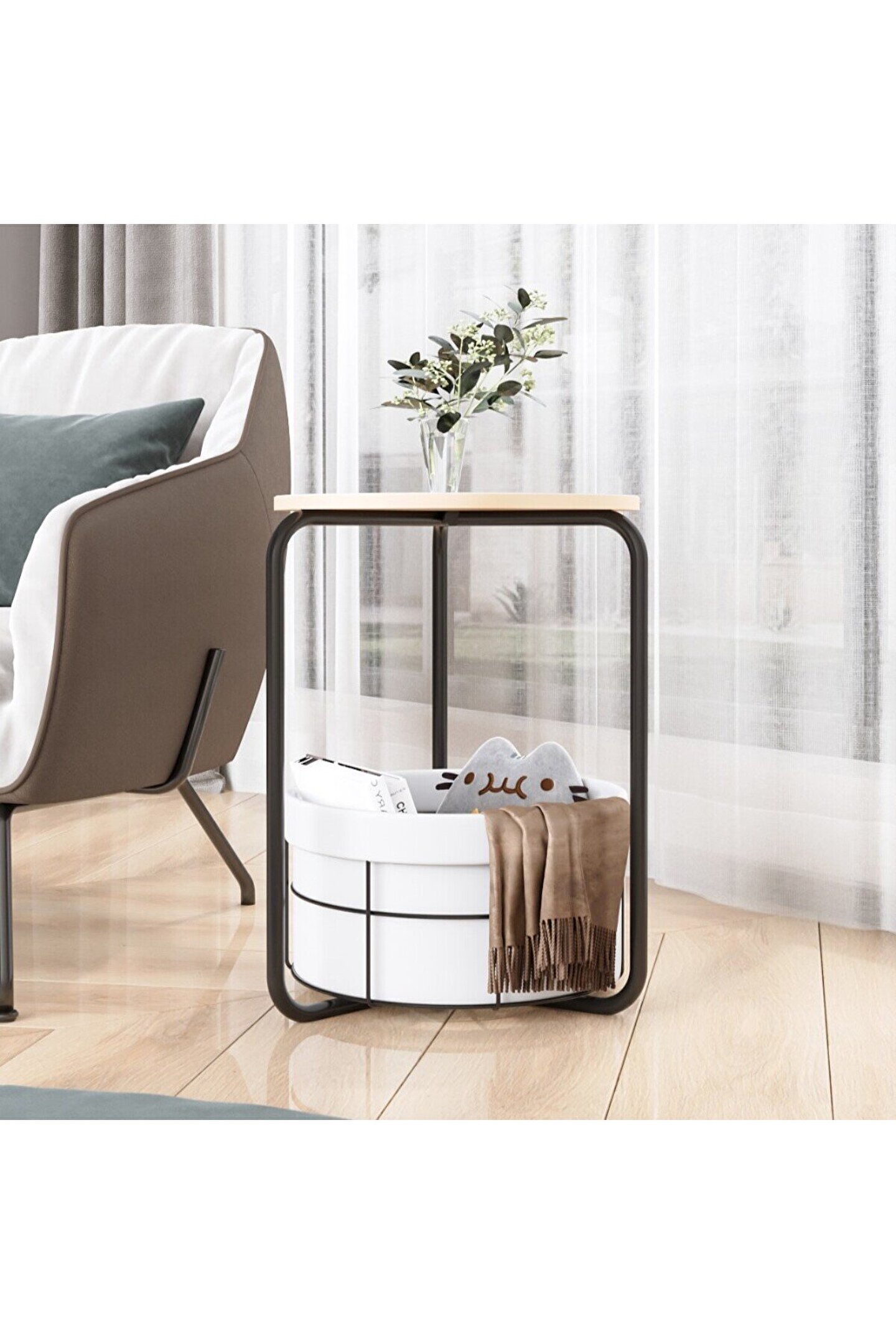 Sehpanın yuvarlak şekli ve ideal ölçüleri kullanışlıdır. Yüksekliği 60 cm, çapı 42 cm olan bu sehpa, hem geniş bir kullanım alanı sunar hem de zarif bir görünüm sağlar. İki raf arası yükseklik 45 cm olup, alt kısımda ekstra depolama alanı sunar. Bu alan, kitaplarınızı, dergilerinizi veya dekoratif objelerinizi düzenli bir şekilde saklamanızı sağlar.