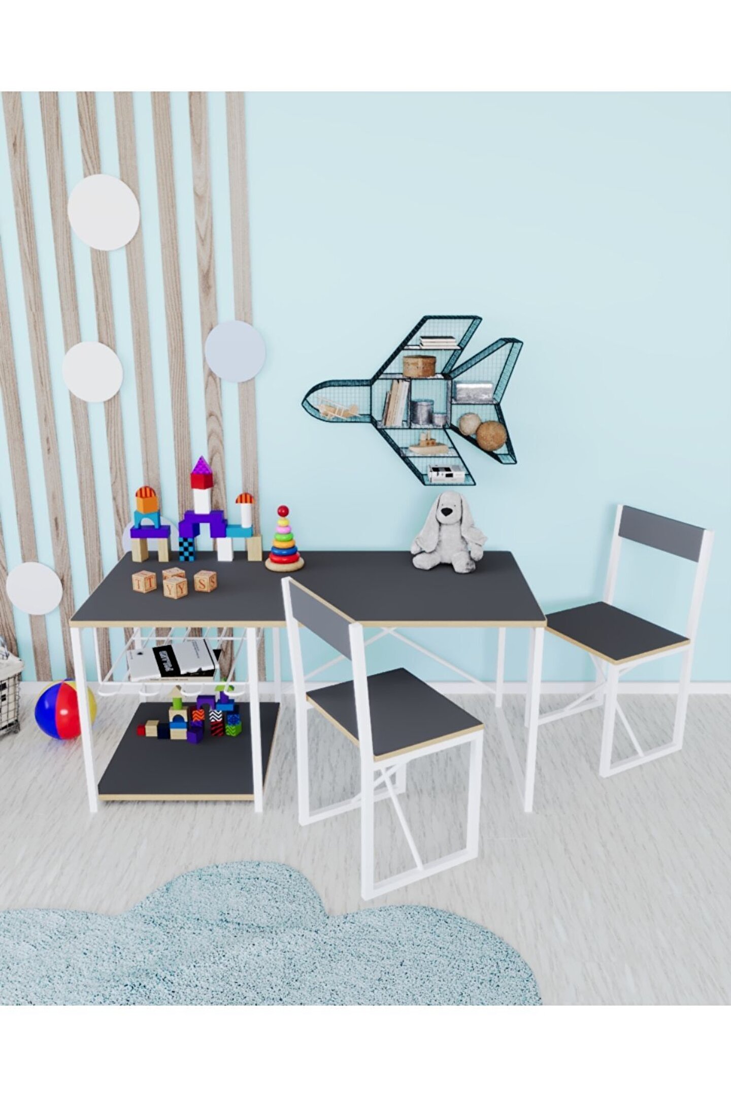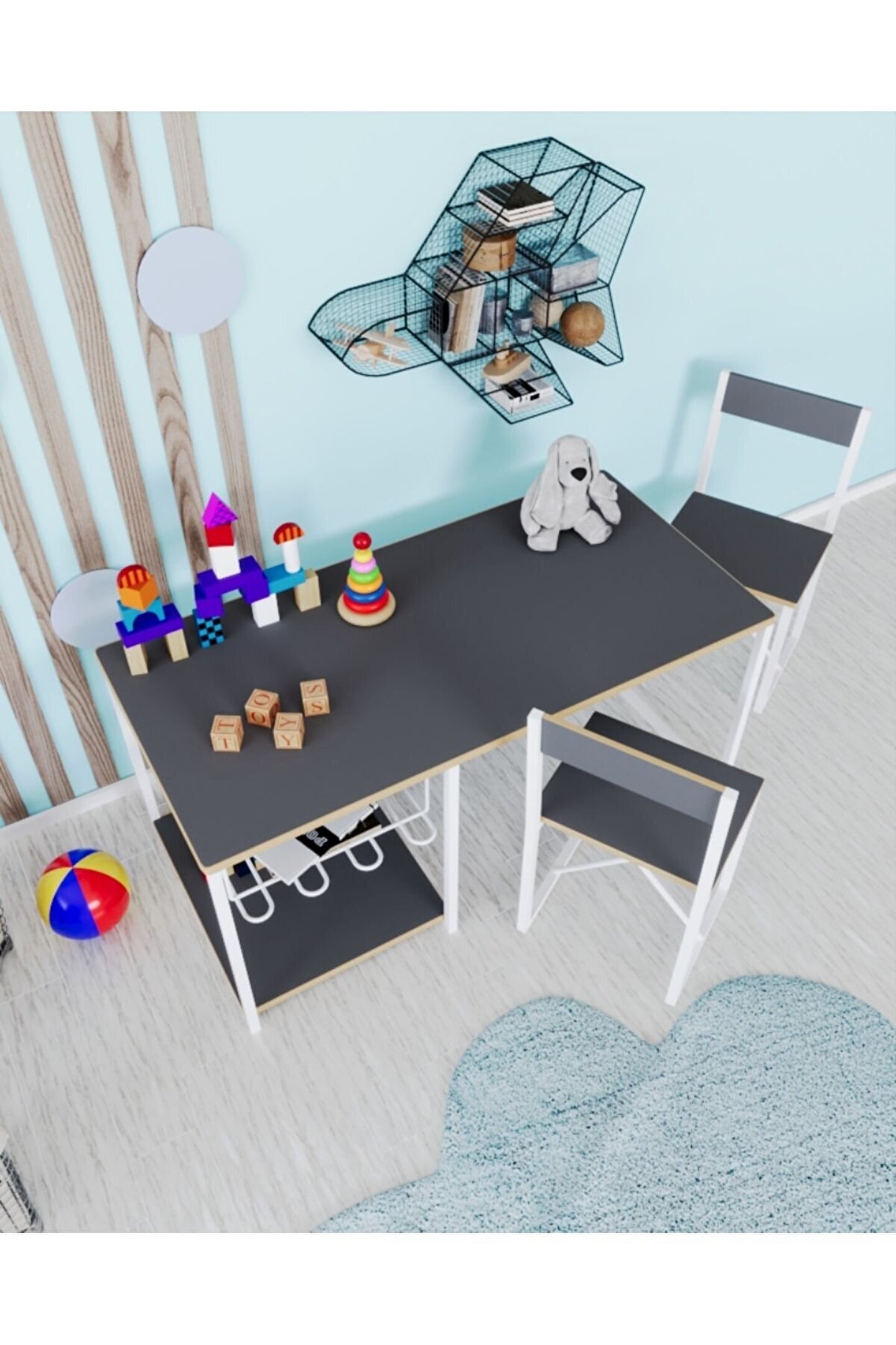 Çocuk Çalışma Masası Ve Sandalyesi Oyun Etkinlik Aktivite Masası Çocuklarınız ile birlikte çalışma yapabileceğiniz masa ve sandalye takımı. ; Malzeme: 12 mm 1. Kalite MDF ve 15*15 metal profil ayaklar. ; Paket içeriği: 1 adet masa 2 Adet sandalye, 1 adet tel raf. ; Masa ölçüleri: yükseklik: 40 cm, uzunluk: 90 cm, genişlik: 45 cm Sandalye ölçüleri: oturma alanı yüksekliği 28 cm, uzunluk 27 cm, genişlik: 24 cm, yerden sırt yüksekliği 50 cm .MDF yapısı, metal ayaklar sayesinde uzun yıllar kullanım sağlar. ; Ayakların altında bulunan plastik pabuçlar sayesinde zemine zarar vermez. ;