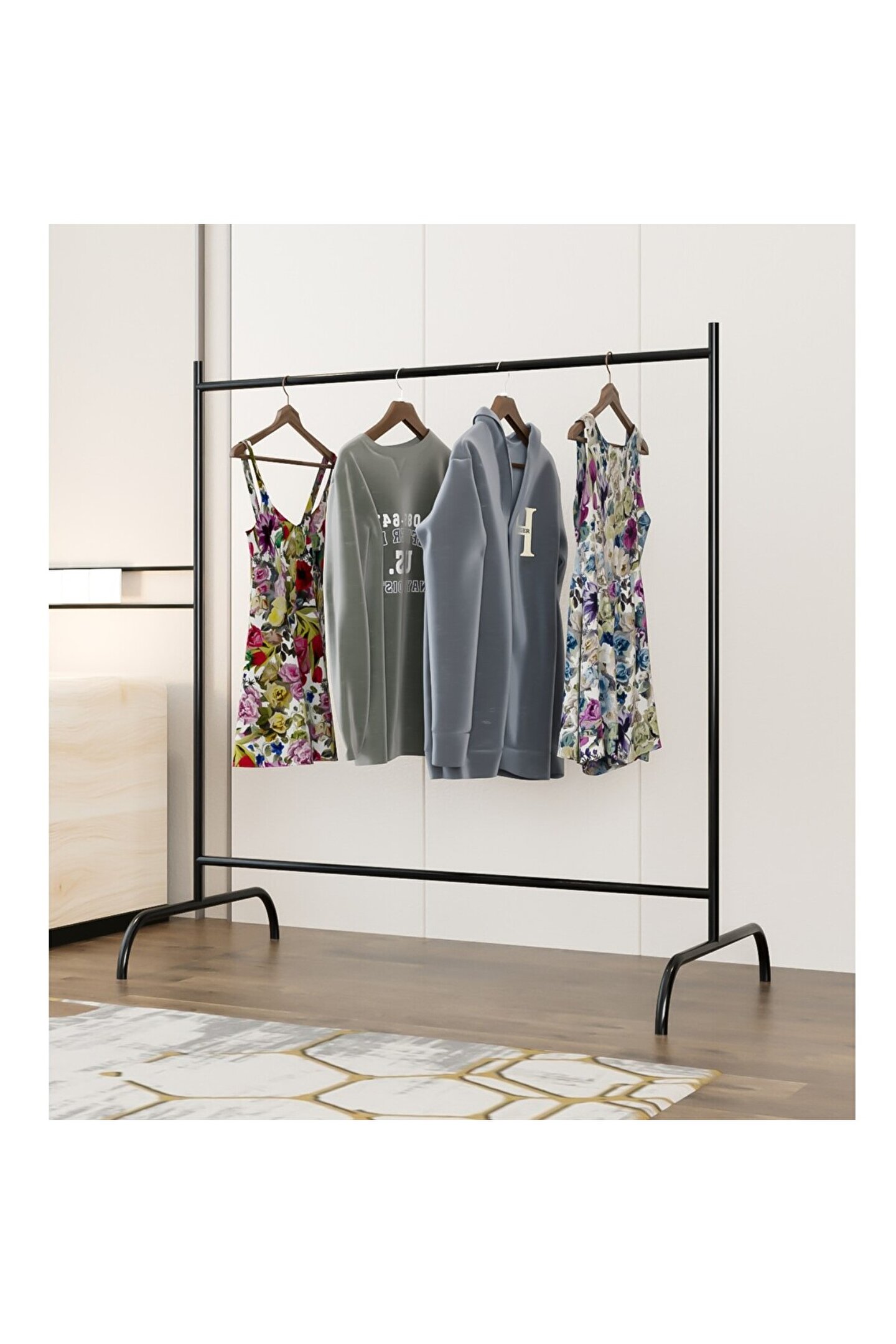 Konfeksiyon Askısı Ayaklı Askılık Elbise Askılığı Siyah, giysilerinizi düzenli ve erişilebilir bir şekilde saklamanızı sağlayan pratik bir ev mobilyasıdır. Bu ürün, ev veya ofis ortamında kullanılan klasik askılıklardan farklı olarak, modern ve minimalistik bir tasarıma sahiptir. Elbiselerinizi düzgün bir şekilde asmanızı sağlayarak, dolaplarınızda yer açmanıza yardımcı olur ve aynı zamanda giysilerinizi kırışmadan muhafaza eder. Çizilmeye karşı dayanıklı elektrostatik toz boya ile kaplanmış olan masif profil borudan üretilmiştir. Bu, ürünün hem estetik hem de dayanıklı olmasını sağlar.